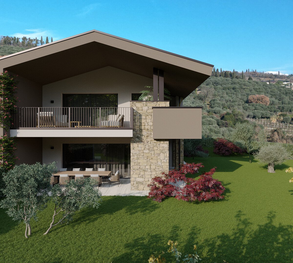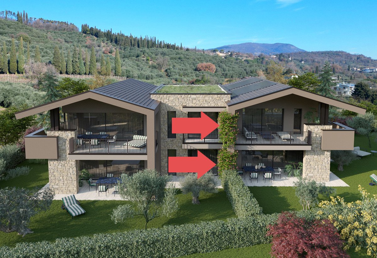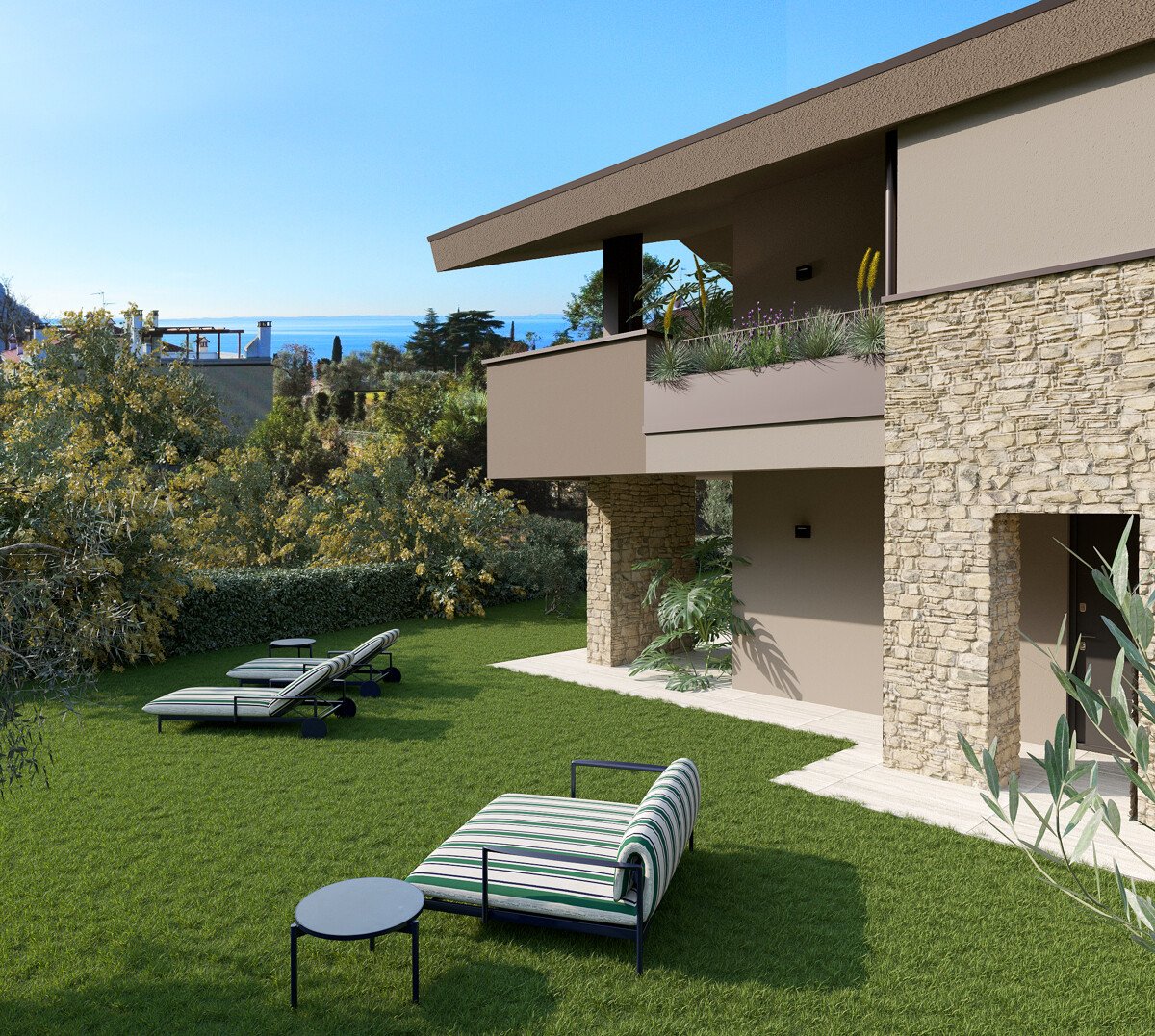 Die großzügigen Außenbereiche schaffen private Rückzugsorte und laden zum Entspannen ein: Erdgeschosswohnungen bieten liebevoll gestaltete Privatgärten, ideal für gesellige Stunden auf der Terrasse oder stille Momente im Grünen. Die Wohnungen in den oberen Etagen verfügen über großzügige, überdachte Veranden bzw. Balkone – der perfekte Ort, um bei einem Glas Wein den Blick über die herrliche Landschaft schweifen zu lassen. Einige Wohnungen bieten einen faszinierenden Blick auf den Gardasee, andere verzaubern mit einer idyllischen Aussicht auf die umliegenden Grünflächen und Berge.