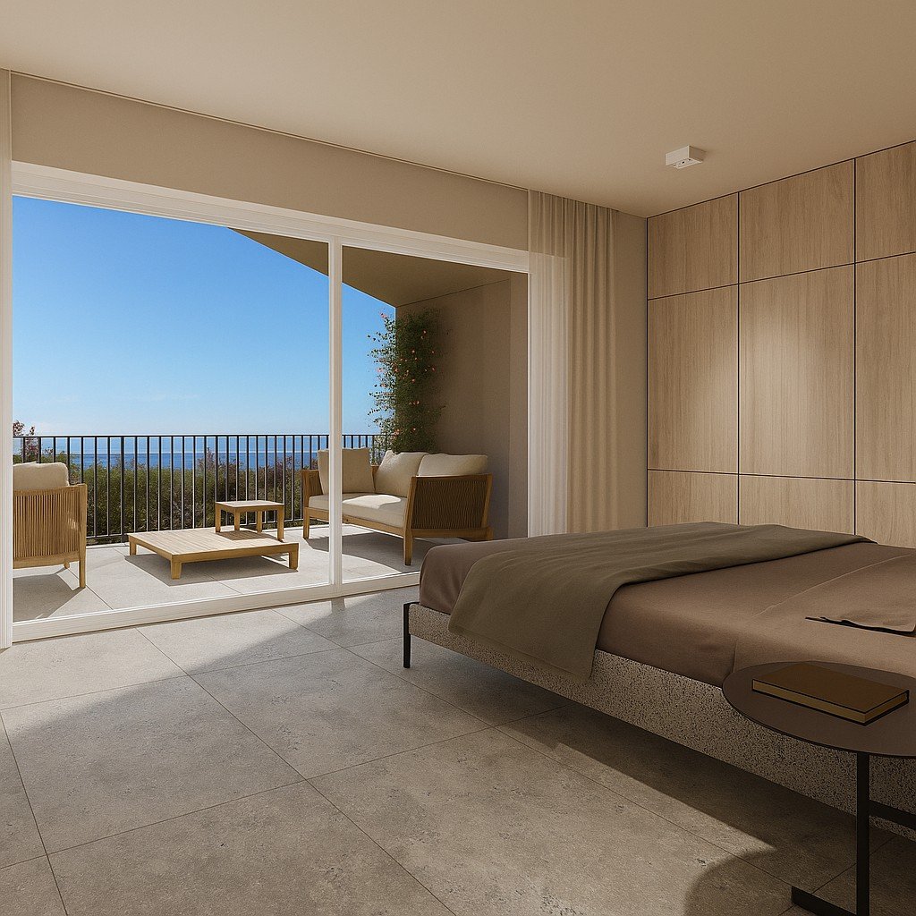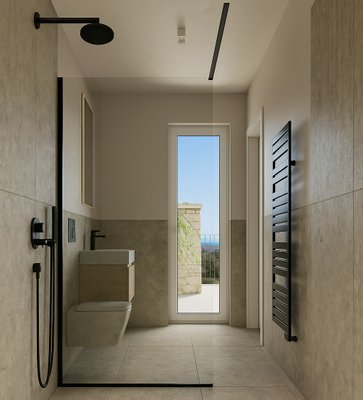 Über die mit Naturstein belegte Treppe gelangt man ins Obergeschoss mit drei Schlafzimmern und zwei Bädern. Die beiden Gästezimmer bieten Zugang zu einem Balkon mit Blick auf den Olivenhain. Das Hauptschlafzimmer überzeugt mit Bad en suite und einer geschützten, großen Loggia – perfekt für ruhige Stunden im Freien.