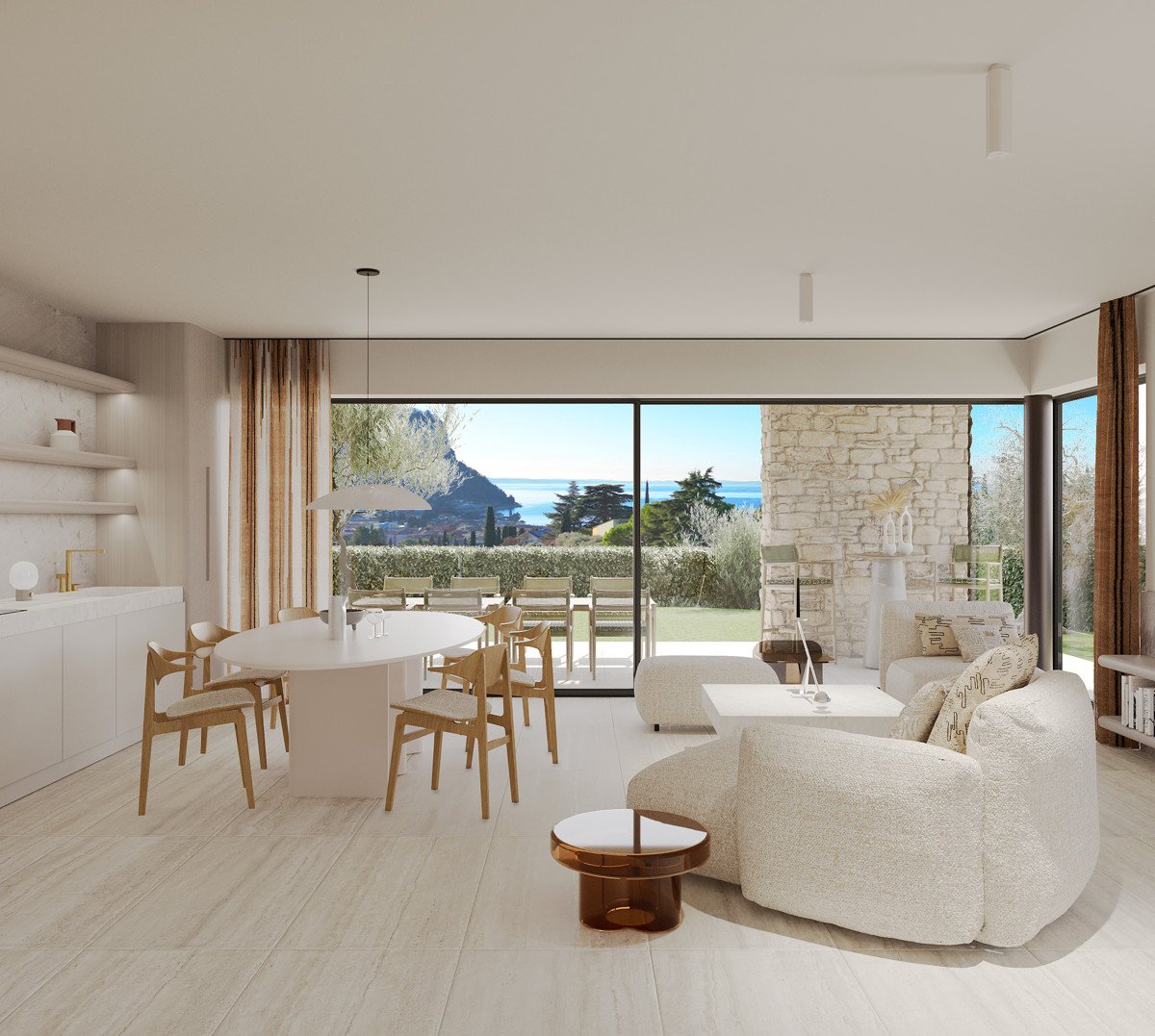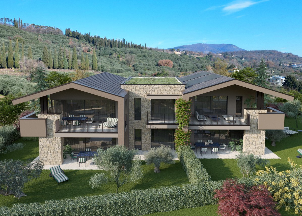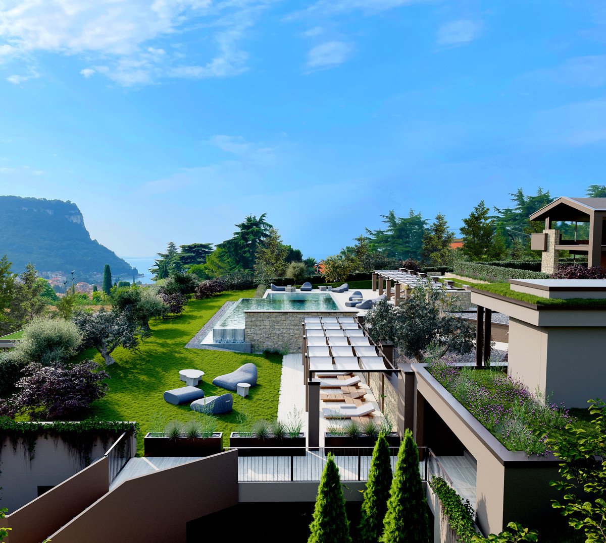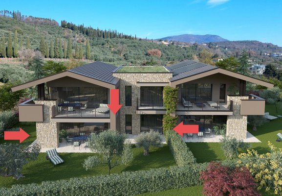 Die großzügigen Außenbereiche schaffen private Rückzugsorte und laden zum Entspannen ein: Erdgeschosswohnungen bieten liebevoll gestaltete Privatgärten, ideal für gesellige Stunden auf der Terrasse oder stille Momente im Grünen. Die Wohnungen in den oberen Etagen verfügen über großzügige, überdachte Veranden bzw. Balkone – der perfekte Ort, um bei einem Glas Wein den Blick über die herrliche Landschaft schweifen zu lassen. Einige Wohnungen bieten einen faszinierenden Blick auf den Gardasee, andere verzaubern mit einer idyllischen Aussicht auf die umliegenden Grünflächen und Berge.