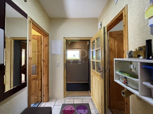 Schon beim Betreten des Hauses spürt man die einladende Stimmung. Über den Windfang gelangt man in den zentralen Flur. Zur rechten Seite befindet sich die gemütliche Küche, die mit einer zusätzlichen Kammer praktischen Stauraum bietet. Auf der linken Seite liegt das freundliche Badezimmer mit Badewanne. Geradeaus öffnet sich das behagliche Wohnzimmer, das durch seinen direkten Zugang in den sonnigen Wintergarten sowie auf die großzügige Terrasse besticht – ein perfekter Ort für erholsame Stunden oder gesellige Abende. Über die Treppe gelangt man in das Obergeschoss, das zwei weitere, hell geschnittene Zimmer bereithält sowie ein modernes Bad mit komfortabler Dusche.