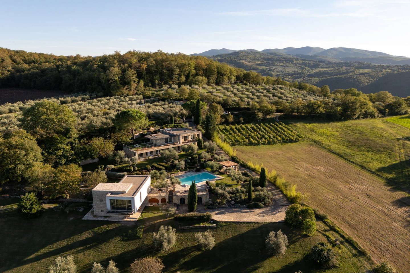Eine spektakuläre Villa inmitten der umbrischen Hügel, nur 10 Minuten von Todi entfernt, besticht diese exquisite Design-Residenz, erbaut 2016, durch moderne, lichtdurchflutete Architektur und einen freien Blick auf die sanften umliegenden Hügel.Die Villa