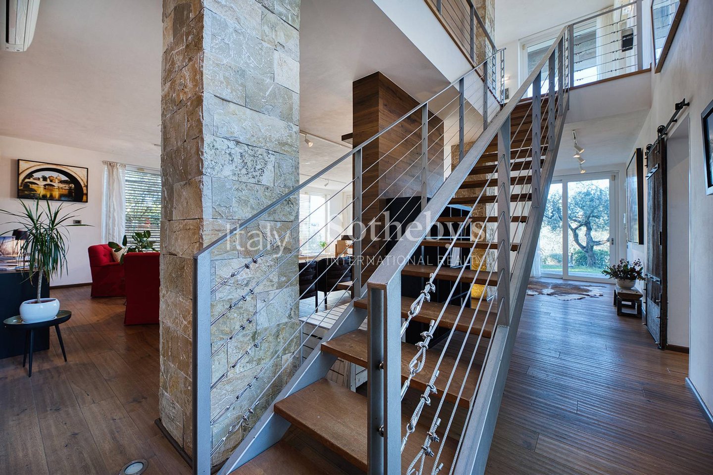 Die Villa erstreckt sich über zwei Ebenen. Im Erdgeschoss befinden sich ein geräumiges, einladendes Wohnzimmer, perfekt zum Entspannen und Genießen der Ruhe der Landschaft, drei großzügige Schlafzimmer mit eigenem Bad und direktem Zugang zur Loggia und zum Garten sowie ein Hauswirtschaftsraum. Über eine elegante Holz- und Eisenstiege, die die Höhe der Räume betont, gelangt man in den ersten Stock, wo sich ein Wohnzimmer, der Essbereich, die offene Küche sowie das Hauptschlafzimmer mit eigenem Bad und Panoramaterrasse befinden.