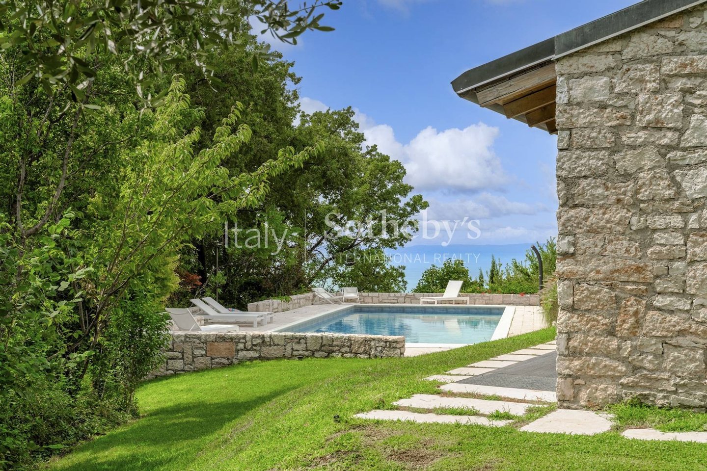 In a panoramic position above the picturesque town of Bardolino, stands this stone villa surrounded by an enchanting garden with a private woodland of about 4,000 sqm (43,055 sq ft / 0.99 acres): an oasis of peace and nature offering complete privacy and a fairytale setting. The saltwater pool, fully renovated in 2024, opens onto the lake and the Sirmione peninsula, providing moments of relaxation and unforgettable sunsets.