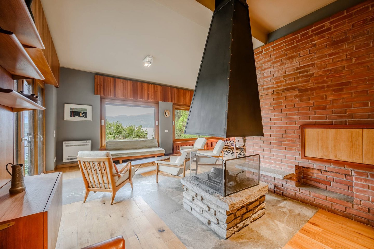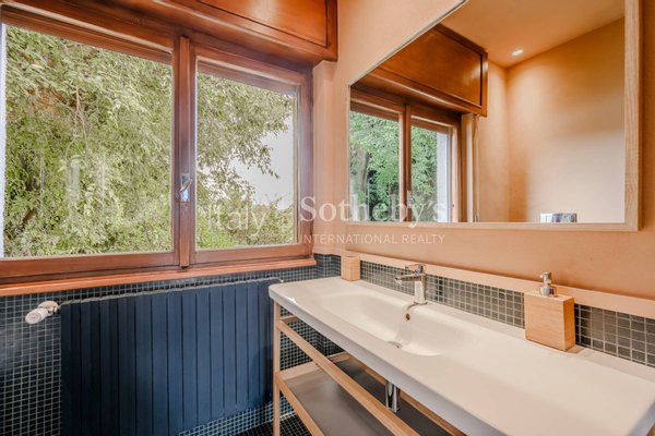 Das Haus, mit zwei unabhängigen Eingängen, erstreckt sich über mehrere Ebenen. Im Untergeschoss befindet sich der Wohnbereich, geprägt von großen Panoramafenstern, die sich direkt zum Garten und zum See öffnen und helle, einladende Räume schaffen. Auf dieser Ebene liegt auch die Wohnküche, verbunden mit den Außenbereichen sowie einem Gäste-Bad.