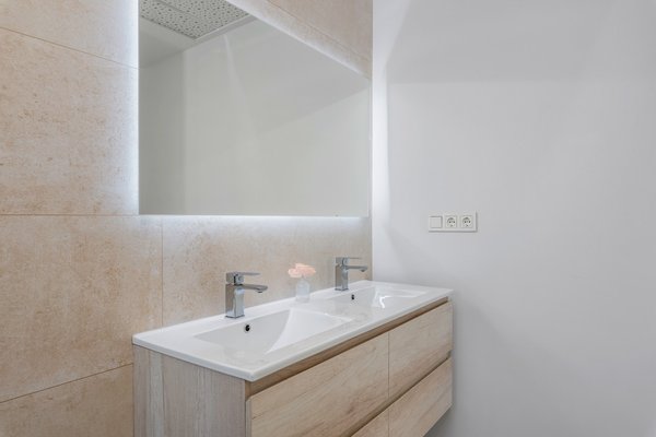 Die Innenräume verfügen über einen offenen Wohn- und Essbereich mit amerikanischer Küche, ein Schlafzimmer mit Doppelbett und ein Gästebad im Erdgeschoss. Das Wohnzimmer hat Terrassentüren mit direktem Zugang zum Garten und zum privaten Swimmingpool. In der ersten Etage der Villa mit 3 Schlafzimmern befindet sich das Hauptschlafzimmer mit eigenem Bad und ein weiteres Doppelschlafzimmer mit eigenem Bad. Die erste Etage der Villa mit 4 Schlafzimmern verfügt über das Hauptschlafzimmer mit eigenem Bad, zwei weitere Doppelschlafzimmer und ein Gästebad. Das Hauptschlafzimmer in beiden Optionen hat Zugang zu einer privaten Terrasse und eine interne Treppe führt zu einer großen Dachterrasse mit Meerblick, die bereits für eine Sommerküche, einen Jacuzzi und eine Außendusche vorbereitet ist.