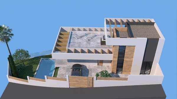 Dieses besondere Villenmodell erstreckt sich über zwei Ebenen mit einem offenen Kellergeschoss. Die Innenaufteilung besteht aus einem geräumigen, offenen Wohn- und Essbereich mit großen Fenstern, die viel natürliches Licht in den Raum fließen lassen und sich zur Terrasse hin öffnen. Im Hauptwohnbereich befindet sich eine voll ausgestattete moderne Küche im amerikanischen Stil mit Hochglanz- oder Holzoberflächen. Im Erdgeschoss befinden sich außerdem zwei große Doppelschlafzimmer und ein separates Gästebad. Die Innentreppe führt Sie in den ersten Stock, wo sich das Hauptschlafzimmer mit eigenem Bad befindet. Das Hauptschlafzimmer und der Flur im ersten Stock haben Zugang zur großen Sonnenterrasse von über 50m2, um den ganzen Tag die Sonne zu genießen.