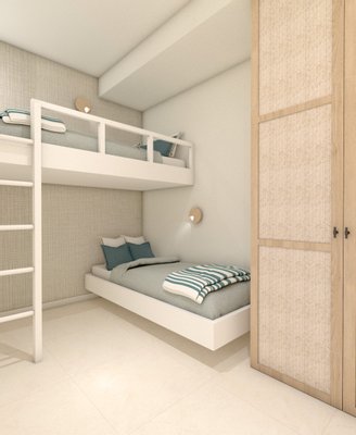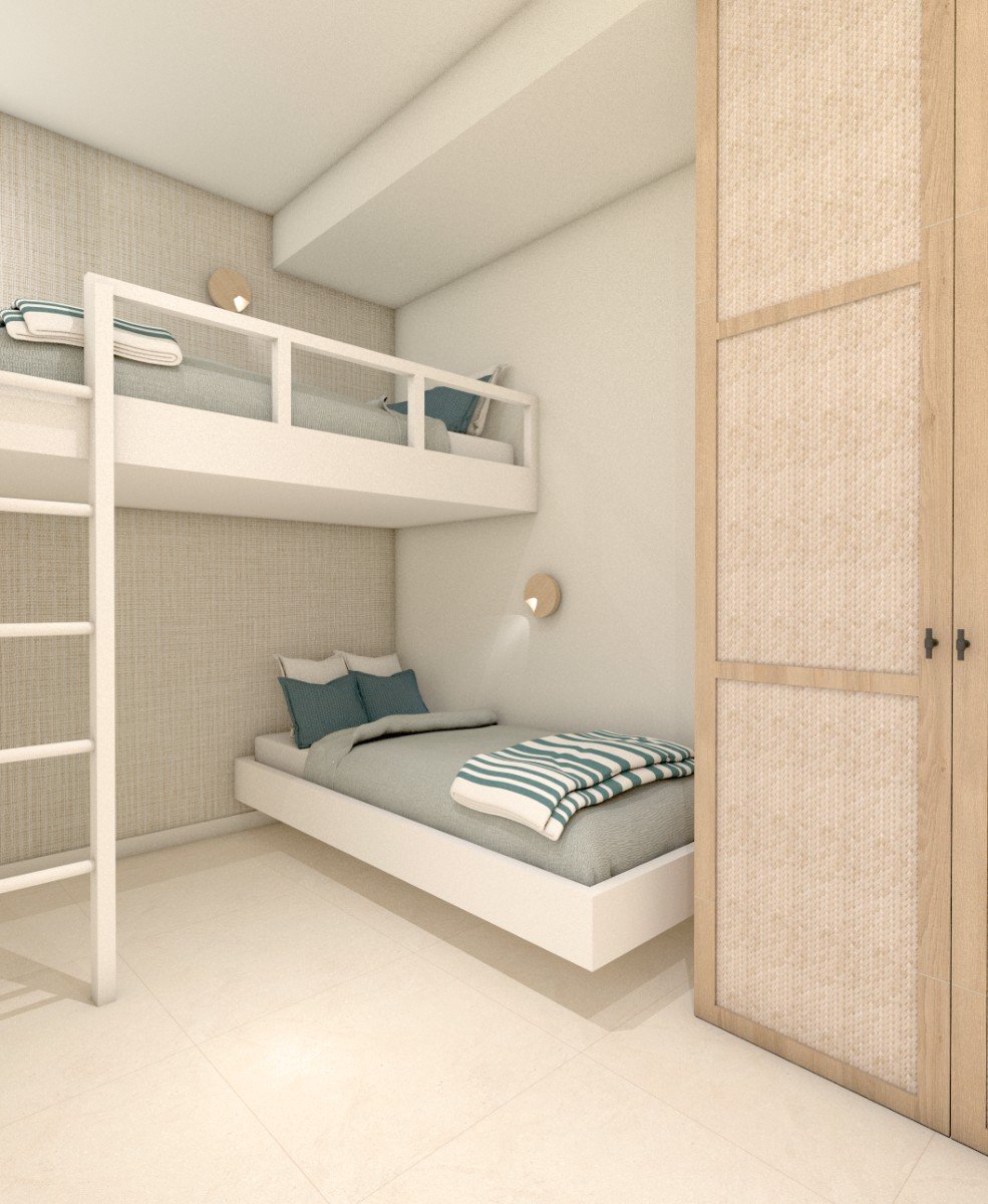 Die Innenaufteilung besteht aus einem Eingangsbereich, der zu einem geräumigen, offenen Wohn- und Essbereich mit großen Terrassentüren führt, die Zugang zur Terrasse bieten. Im Hauptwohnbereich befindet sich eine voll ausgestattete, moderne Küche im amerikanischen Stil mit einer Kochinsel in der Mitte. Die primäre Suite bietet ein großes Schlafzimmer mit eigenem Bad und Ankleidebereich. Es gibt zwei weitere große Schlafzimmer mit Doppelbett und ein separates Gästebad. Die Wohnungen im obersten Stockwerk verfügen über eine Außentreppe, die Zugang zur großen Dachterrasse mit Sommerküche bietet, die sich perfekt für Mahlzeiten im Freien eignet.