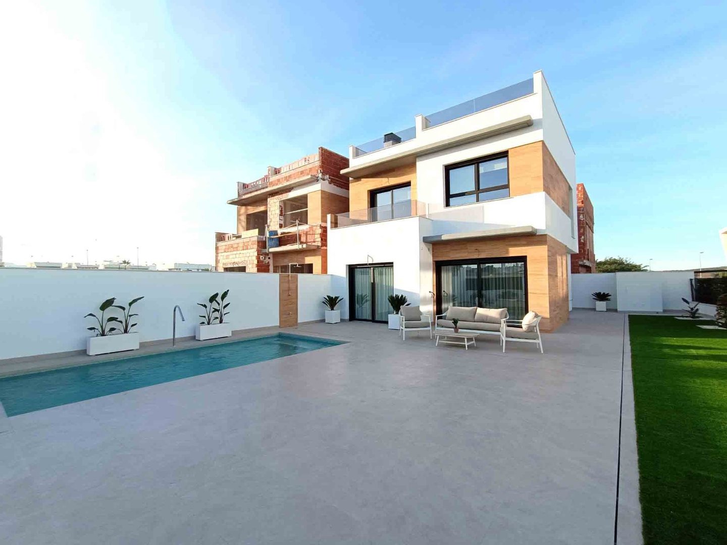 Die Eigenschaften sind mit den höchsten Qualitäten und Oberflächen gebaut, im Preis inbegriffen ist eine Klimaanlage, Fußbodenheizung in den Badezimmern, Küche Elektrogeräte (Backofen, Induktionskochfeld, Dunstabzugshaube, Mikrowelle, Kühlschrank mit Gefrierfach und Geschirrspüler), Einbauschränke in allen Schlafzimmern, Innen- und Außen-LED-Beleuchtung, elektrische Rollläden, privaten Swimmingpool und einen privaten Parkplatz auf dem Grundstück.