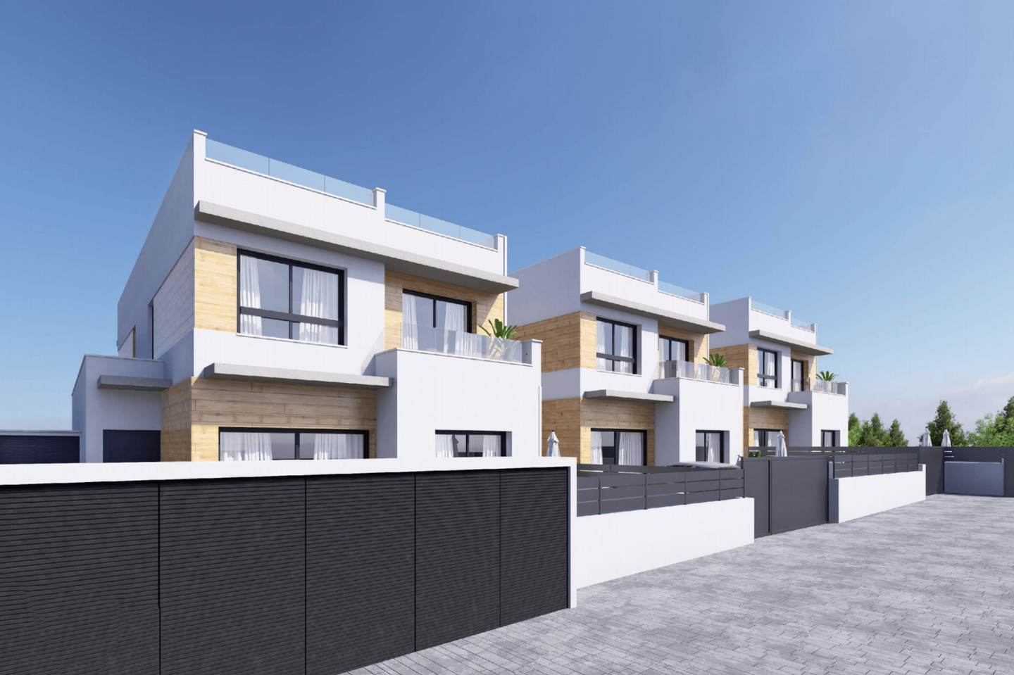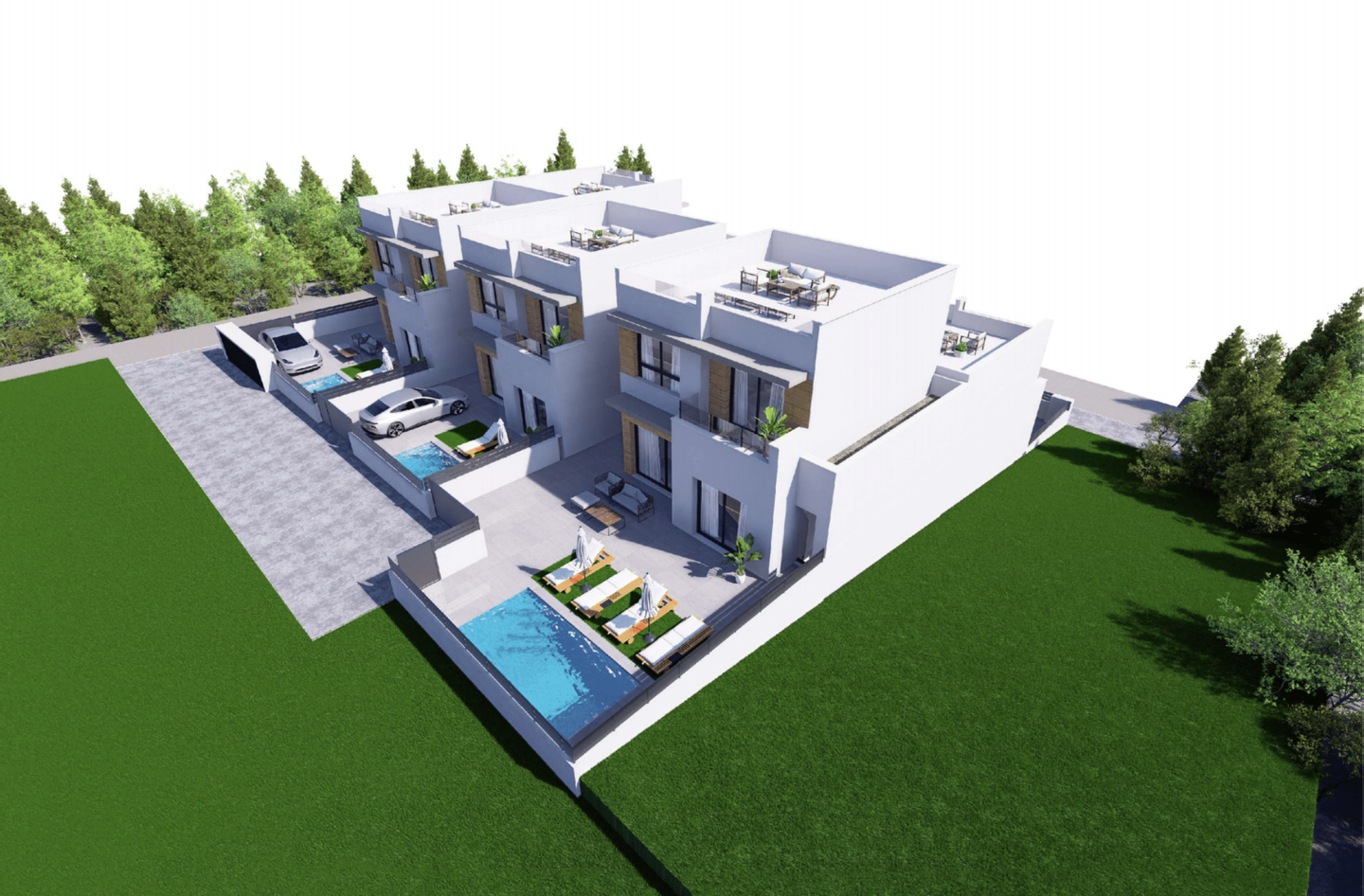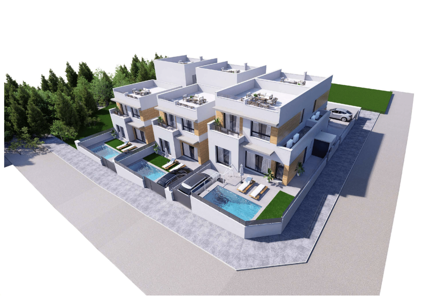 Die Grundstücke sind bis zu 190 m2 groß und bieten einen großen privaten Garten und eine Terrasse mit einem 2,5 x 5 m großen privaten Swimmingpool sowie eine große Sonnenterrasse auf dem Dach. Die Villen sind mit geräumigen Innenräumen ausgestattet und es besteht die Möglichkeit, die Wohnfläche durch ein Kellergeschoss zu erweitern.