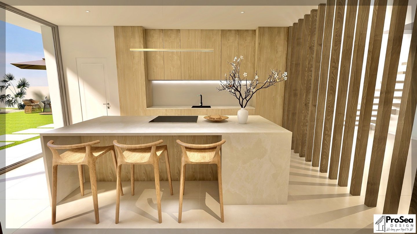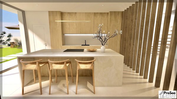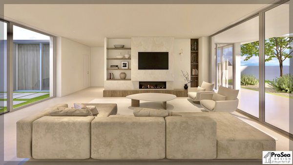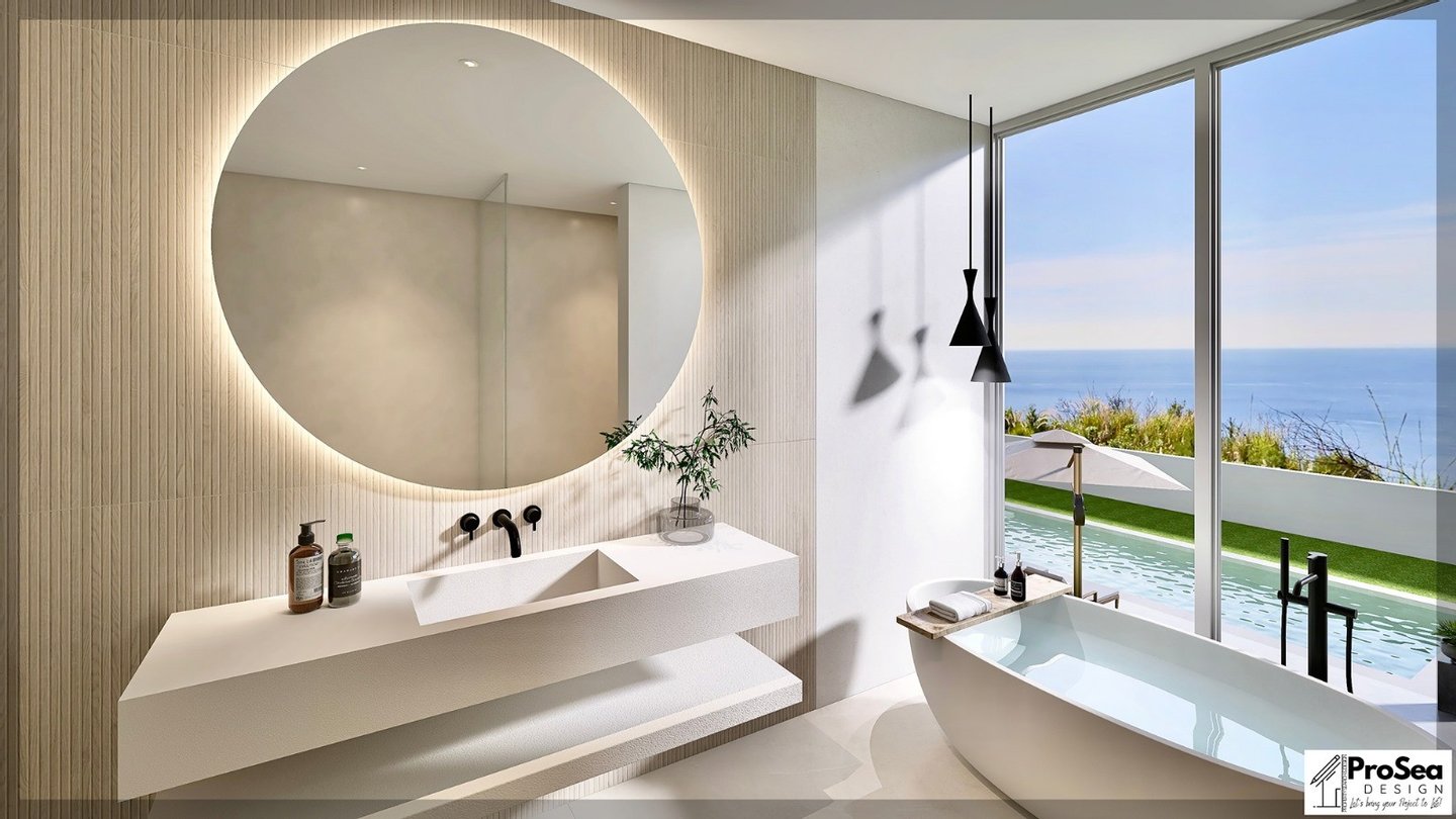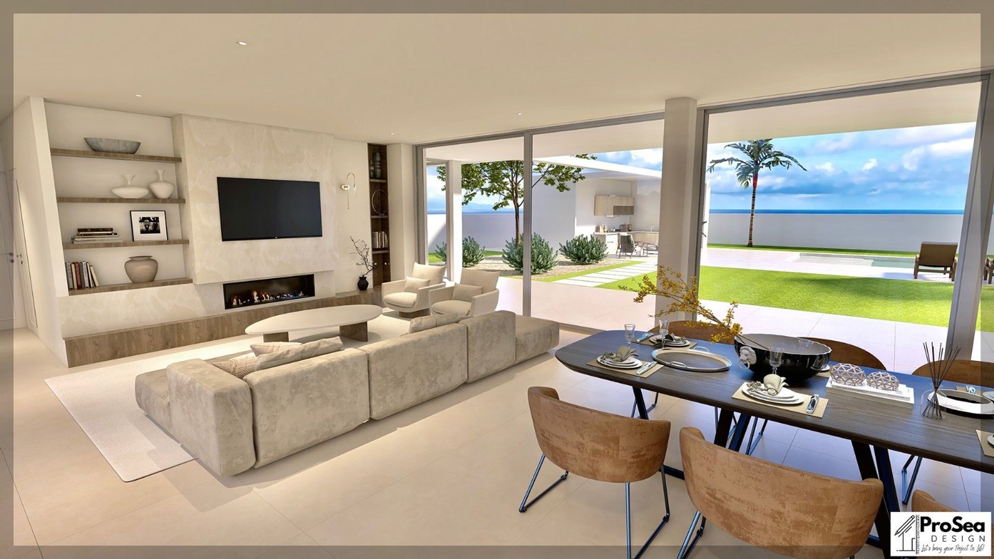 In Übereinstimmung mit dem Projekt besteht die Innenaufteilung aus einer eleganten Eingangshalle, die zum hellen und geräumigen offenen Wohn- und Essbereich führt, mit großen Fenstern auf beiden Seiten, die viel natürliches Licht in den Wohnraum lassen und einen Blick auf den privaten Garten und den Swimmingpool bieten. Im Hauptwohnbereich befindet sich eine schöne, voll ausgestattete moderne Küche mit Mittelinsel, eine separate Waschküche und ein Gäste-WC. Im Erdgeschoss befinden sich außerdem zwei große Doppelschlafzimmer und ein separates Gästebad. Die Innentreppe führt Sie in den ersten Stock, wo Sie ein zweiter Wohnbereich erwartet. Das beeindruckende Hauptschlafzimmer mit großem Schlafzimmer, en-suite Badezimmer mit Badewanne und extra großem Ankleidebereich ist wirklich beeindruckend. Es gibt zwei weitere große Doppelschlafzimmer, beide mit eigenem Bad und Ankleidebereich. Alle Zimmer im ersten Stock haben große Fenster, die auf die Terrasse führen, von der aus man den Blick auf das Meer genießen kann. Es besteht die Möglichkeit, eine Dachterrasse mit fantastischem Panoramablick hinzuzufügen.