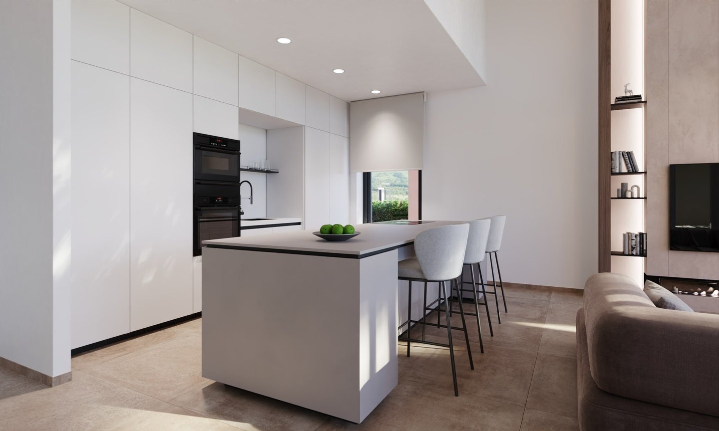 The property boasts four spacious bedrooms and five bathrooms, three of which are en-suite. The heart of the home is the open-plan living and dining area, which flows seamlessly onto a charming covered veranda—perfect for al fresco dining and entertaining. The kitchen is fully fitted with modern appliances, ensuring convenience and style. A sophisticated ventilation system ensures the lower and ground floors remain cool and fresh, while air conditioning in the living room and all bedrooms guarantees year-round comfort.
