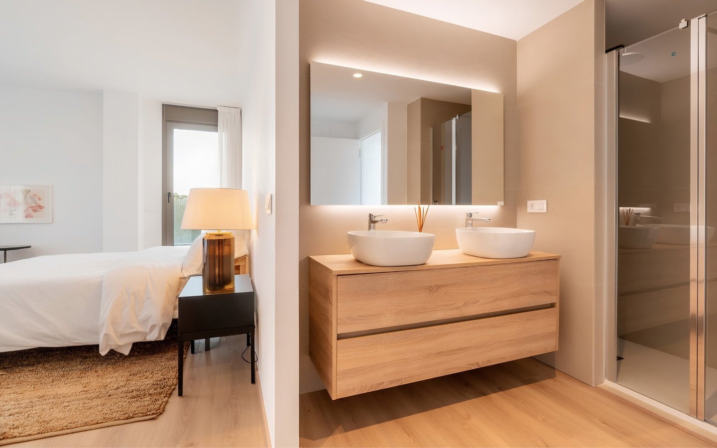 Es stehen mehrere Villenmodelle zur Auswahl, die sich in der Aufteilung leicht unterscheiden. Die Innenausstattung besteht aus einem Eingangsbereich, der zu einem hellen und geräumigen offenen Wohn- und Essbereich mit bodentiefen Fenstern führt, die dafür sorgen, dass Sie viel natürliches Licht in der gesamten Villa haben und Zugang zur Terrasse und zum Garten haben. Im Hauptwohnbereich befindet sich eine voll ausgestattete moderne Küche im amerikanischen Stil mit einer Insel in der Mitte, die mit mattem Laminat oder Holz verkleidet ist. Es gibt auch einen separaten Waschraum und eine Gästetoilette. Im Erdgeschoss befinden sich außerdem zwei Doppelschlafzimmer, beide mit eigenem Bad. Die Innentreppe führt Sie in den ersten Stock, wo sich die beeindruckende Hauptsuite mit einem großen Schlafzimmer, einem eigenen Bad und einem Ankleidebereich befindet. Die Primary Suite hat Zugang zu zwei Sonnenterrassen auf der Vorder- und Rückseite des Anwesens. Je nach Villenmodell gibt es auch Optionen mit einem Schlafzimmer im Erdgeschoss und zwei Schlafzimmern im ersten Stock. Die Villen, die über ein Untergeschoss verfügen, sind über eine Innentreppe zu erreichen. Hier befinden sich die private Garage, ein englischer Innenhof, der natürliches Licht hereinlässt, und zusätzliche Räume, die sich perfekt für zusätzliche Schlafzimmer, ein Büro, ein Fitnessstudio, einen Mehrzweckraum oder Stauraum eignen, je nach Ihren Bedürfnissen und Anforderungen.