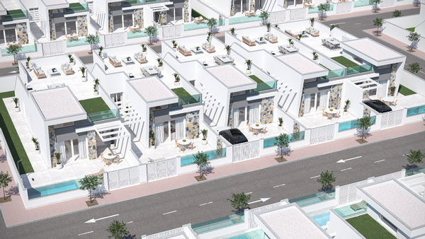 Ein brandneues Projekt mit einem herrlichen Komplex, bestehend aus 5 unabhängigen Villen mit 3 Schlafzimmern, 2 Bädern und privatem Swimmingpool in La Serena Golf - Los Alcazares (Murcia), in der