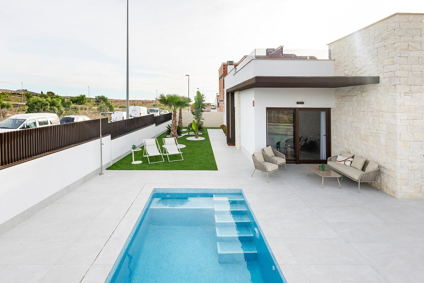 Innerhalb des Projekts befinden sich 48 Immobilien mit drei verschiedenen Wohnungstypen, die alle mit mediterraner Wärme, Modernität und Charme ausgestattet sind. Im Zentrum der Anlage befindet sich der Plaza-Bereich mit schönen Gemeinschaftsgärten, einem großen Gemeinschaftspool und einem Kinderspielplatz. Diese hochwertigen Villen bieten ein ausgezeichnetes Preis-Leistungs-Verhältnis und verfügen alle über ein eigenes Grundstück mit großer Terrasse und Garten, einen privaten Swimmingpool und einen Parkplatz. Die Häuser verfügen außerdem über einen Energieausweis der Klasse A, um maximalen Komfort und Energieeinsparung durch Photovoltaik-Solarzellen, thermoakustische Isolierung mit erhöhter Dichte an allen Wänden und Fenstern (ClimaGuard Premium) zu gewährleisten.