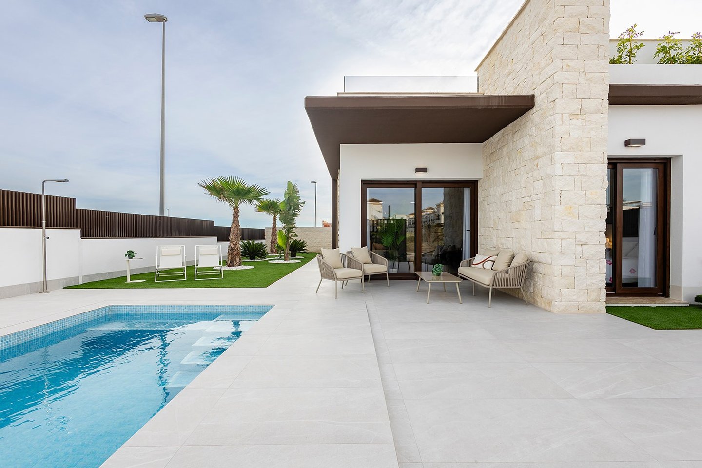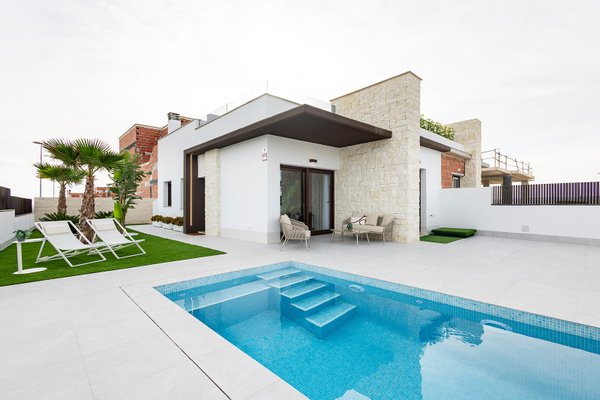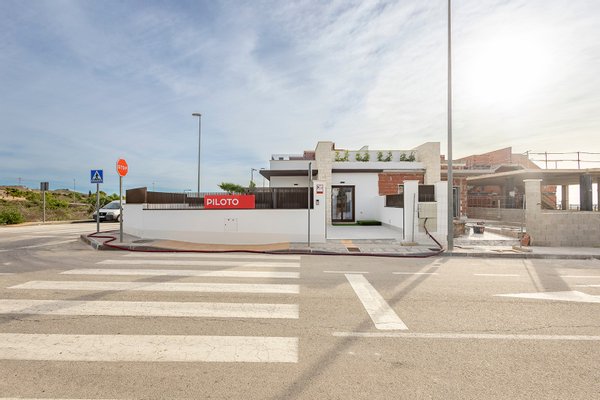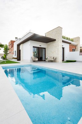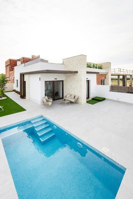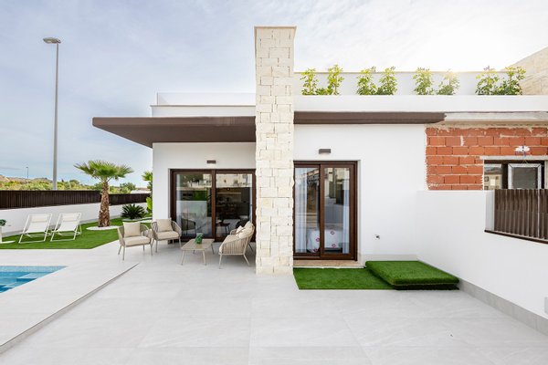 Diese Villa ist auf einer Ebene mit einer optionalen Dachterrasse Solarium. Die Inneneinrichtung besteht aus einem geräumigen, offenen Wohn- und Essbereich mit Terrassentüren, die auf die Terrasse und den Garten führen. Innerhalb des Hauptwohnraums befindet sich eine moderne Küche im amerikanischen Stil, die mit niedrigen und hohen Schränken sowie einer Bank aus Feinsteinzeug ausgestattet ist. Das Hauptschlafzimmer befindet sich auf der Vorderseite des Hauses und verfügt über ein eigenes Bad. Es gibt ein weiteres großes Schlafzimmer mit Doppelbett und ein separates Gästebad. Die optionale Sonnenterrasse von 60 m2 ist über eine Außentreppe auf der Rückseite des Hauses zu erreichen und eignet sich perfekt, um den ganzen Tag über die Sonne zu genießen. Die Eigenschaften kommen einschließlich Vorinstallation für kanalisierte Klimaanlage, 3 Photovoltaik-Solarzellen, Fußbodenheizung in allen Badezimmern, Dunstabzugshaube in der Küche, elektrische Jalousien, Einbauschränke in allen Schlafzimmern, Video-Gegensprechanlage, privaten Swimmingpool von 5 x 2,5 m mit Außendusche, und einen privaten Parkplatz auf dem Grundstück.