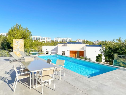 Wunderschöne freistehende Villa im Herzen des Golfplatzes Las Colinas, der zum besten Golf- und Villenresort Spaniens gewählt wurde. Las Colinas beschreibt sich selbst als „eine Welt für sich“. Der Komplex bietet eine sichere Umgebung und Sie können Golf, 3 Restaurants, ein Fitnessstudio und einen Wellnessbereich genießen. Tennisplätze, Paddle-Plätze und markierte Wanderwege runden diese luxuriöse Umgebung ab. Beim Betreten der Villa werden Sie von der Höhe der Decken und dem Licht, das in die Villa fällt, überrascht sein. Ein riesiges Erkerfenster erweitert den Innenraum nach außen, wo Sie eine sonnige Terrasse von 87 m2 und den 10 m langen beheizten Salzwasserpool mit Blick auf die Pinien genießen können.Die auf einem 918 m² großen Grundstück erbaute Villa bietet auf einer Ebene 3 Schlafzimmer mit Ankleidezimmer, darunter eine große Master-Suite, zwei Badezimmer, eine Waschküche und ein großes Wohnzimmer mit voll ausgestatteter offener Küche. Ein unabhängiges Studio von 47 m² mit einem Schlafzimmer und einem Badezimmer rundet dieses schöne Angebot ab. Ihre Fahrzeuge werden nicht ausgesperrt. Die Villa bietet zwei private Außenparkplätze vor dem Haus, aber auch eine geschlossene Garage im Untergeschoss mit über 40 m2 für zwei Autos, ausgestattet mit Ladestationen für Elektrofahrzeuge.Insgesamt bietet die Villa 222,40 m² bebaute Fläche, umgeben von einem von einem Architekten entworfenen Garten und Pflanzen. Absolute Ruhe in luxuriöser Umgebung. Darüber hinaus ist die Villa mit Sonnenkollektoren, einem Wasserentkalkungssystem, einer Warm-/Kalt-Zentralheizung mit Wärmepumpe ausgestattet, die für jeden Raum unabhängig eingestellt werden kann, und die Fenster sind mit elektrischen Rollläden ausgestattet. Alles kann über ein auf Ihrem Mobiltelefon verfügbares Hausautomationssystem konfiguriert und eingestellt werden. Die Villa wurde nach den Standards der Energieeffizienzklasse A gebaut.