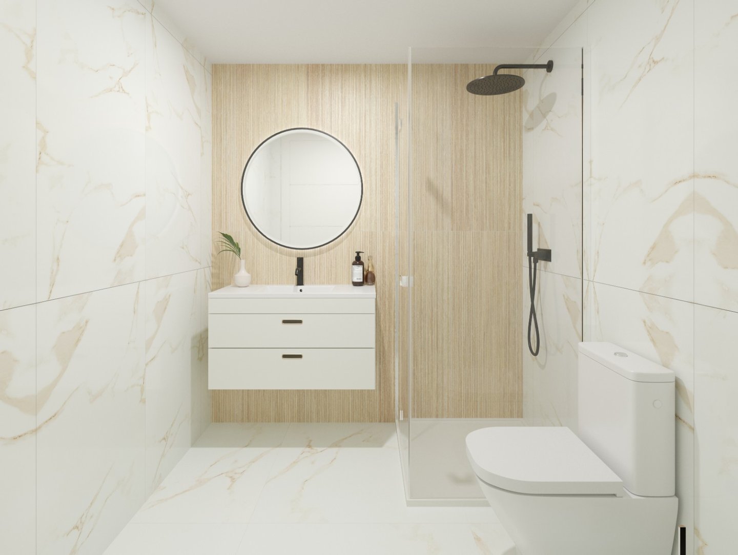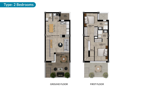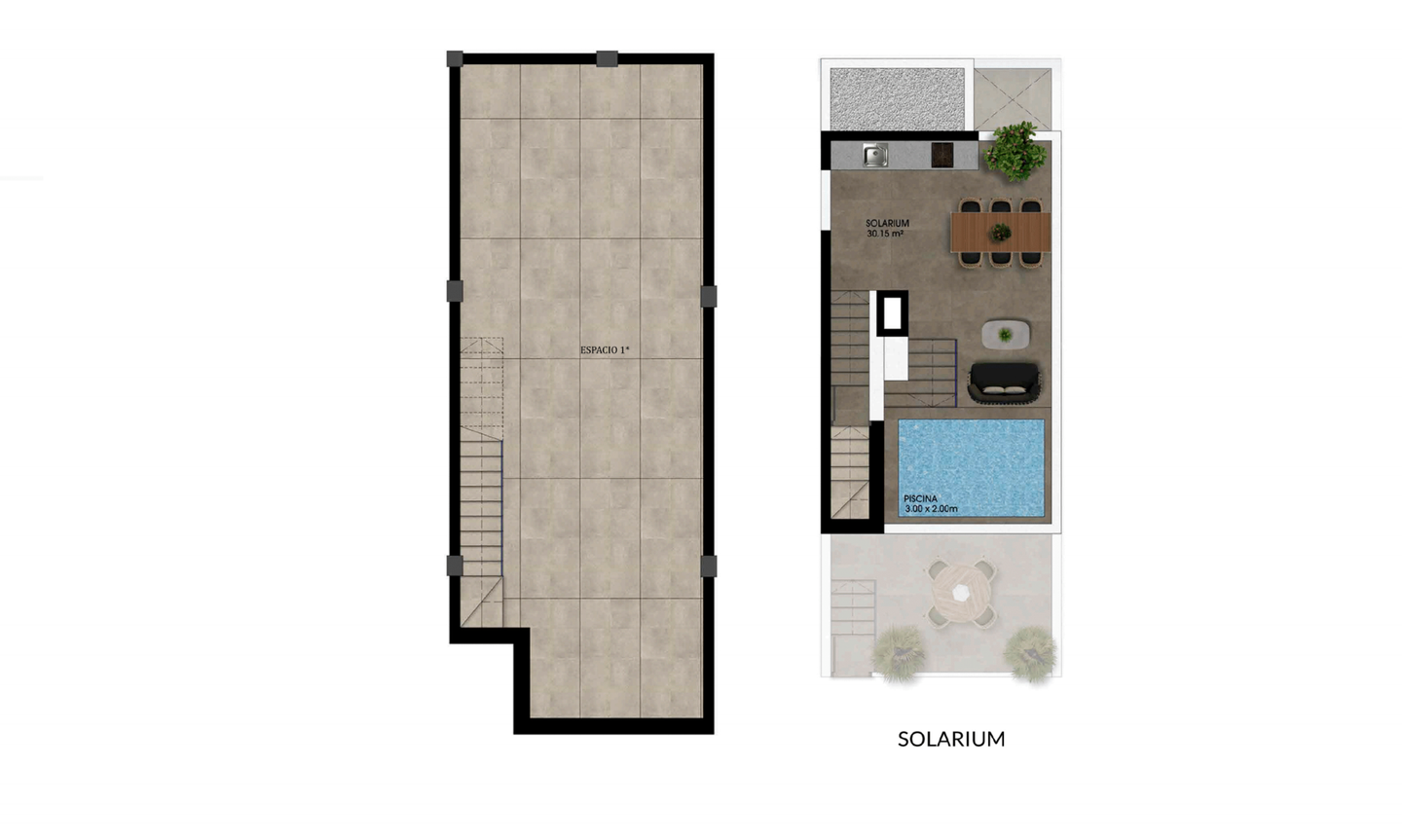 Jede Villa verfügt über drei Etagen, einschließlich einer Dachterrasse, und besticht durch ein modernes Design und feinste Verarbeitung. Die Innenaufteilung besteht aus einem hellen und geräumigen Wohn- und Essbereich mit Terrassentüren, die auf die 13 m2 große Terrasse führen. Im Hauptwohnbereich befindet sich eine moderne Küche im amerikanischen Stil. Je nach Ausführung mit 2 oder 3 Schlafzimmern befinden sich im Erdgeschoss ein Doppelschlafzimmer und ein separates Gästebad (bei der Villa mit 3 Schlafzimmern) oder ein größerer Wohnbereich, eine Waschküche und ein Gäste-WC (bei der Villa mit 2 Schlafzimmern). Die Innentreppe führt Sie in den ersten Stock, wo sich das große Hauptschlafzimmer mit eigenem Bad und Ankleidebereich befindet. Es gibt ein weiteres großes Schlafzimmer mit Doppelbett und eigenem Bad. Die 30 m2 große Dachterrasse ist über die Innentreppe des Anwesens zu erreichen und bietet die Möglichkeit, einen Jacuzzi oder einen privaten Swimmingpool einzubauen, wodurch jeder Raum zu einer persönlichen Oase wird. Zusätzlich können die Bewohner dieser Gemeinschaft einen schönen Gemeinschaftspool genießen.