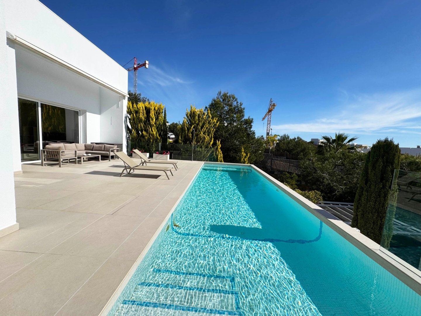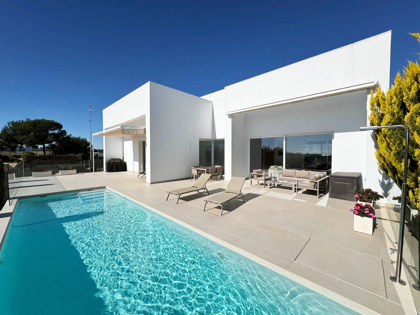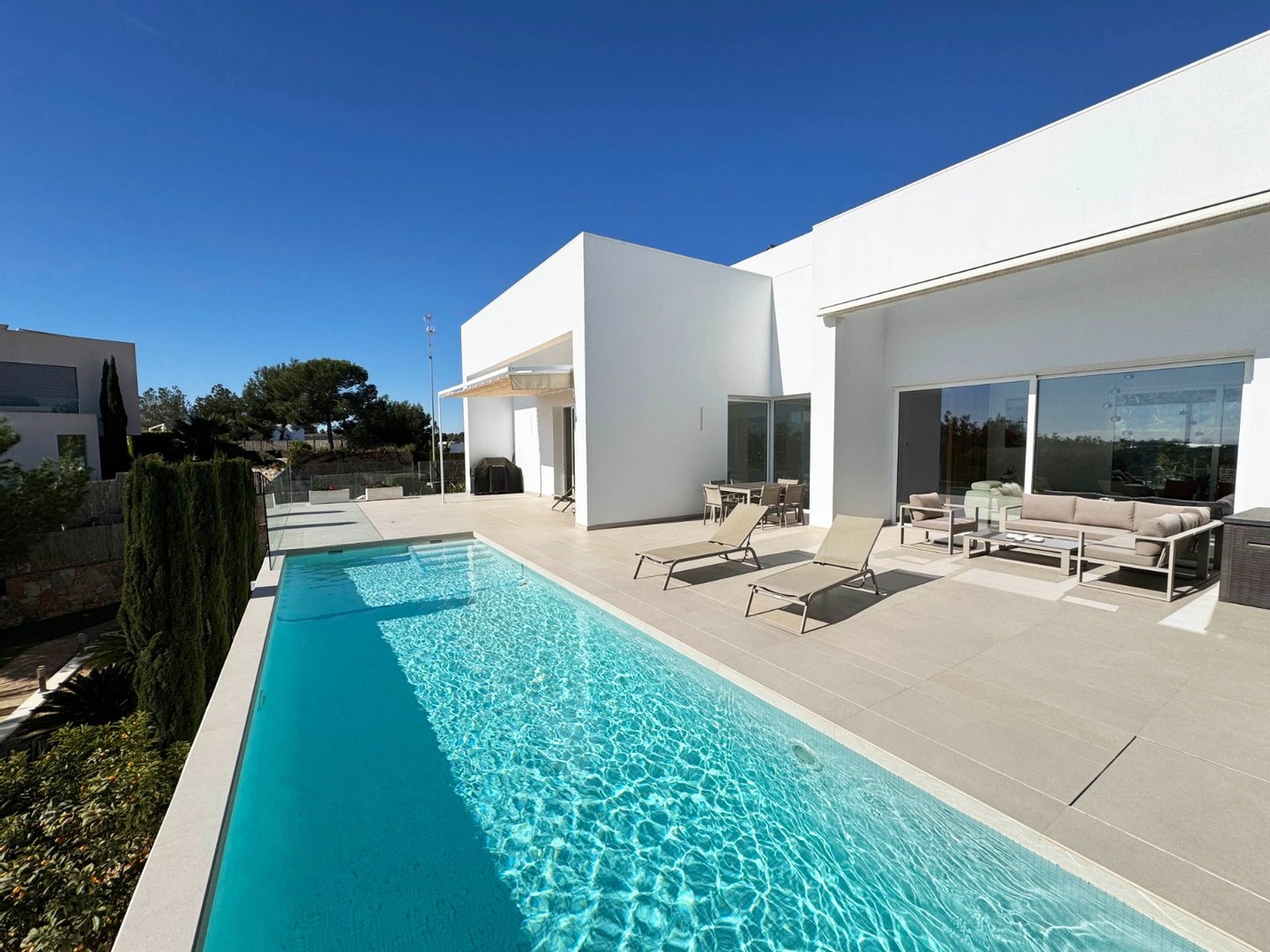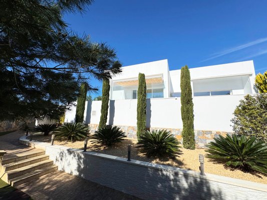 Wunderschöne, moderne Villa im modernen Stil in Olivo -Gemeinde mit privatem Pool und geräumigem Garten. Diese Villa besteht aus 4 Schlafzimmern, 3 Badezimmern + Gast -Toilette, einem privaten Pool mit automatischer Abdeckung und Heizpumpe, Garage und geräumigen Terrassen mit offenem Blick zum Meer. Die Handlung opfert etwa 1488m2 mit einem 269 m2 Build und einer Hauptterrasse von 110 m2 Dachterrasse + 110 m2 Dachterrasse. Sehr private und ruhige Lage in der Olivo -Community. Die Villa ist auf zwei Ebenen mit offener Aussicht von der Hauptterrasse sowie dem Solarium gebaut. Diese Villa wird teilweise eingerichtet und umfasst viele Extras wie Smart Home System, Electric Jungs, Air Con mit Luftzone, Bodenheizung auf beiden Ebenen des Hauses sowie die Abdeck- und Heizpumpe für den privaten Pool. Landscapeed Garden auf verschiedenen Ebenen mit Spielplatz für Kinder und private Sitzbereiche mit Pergola.