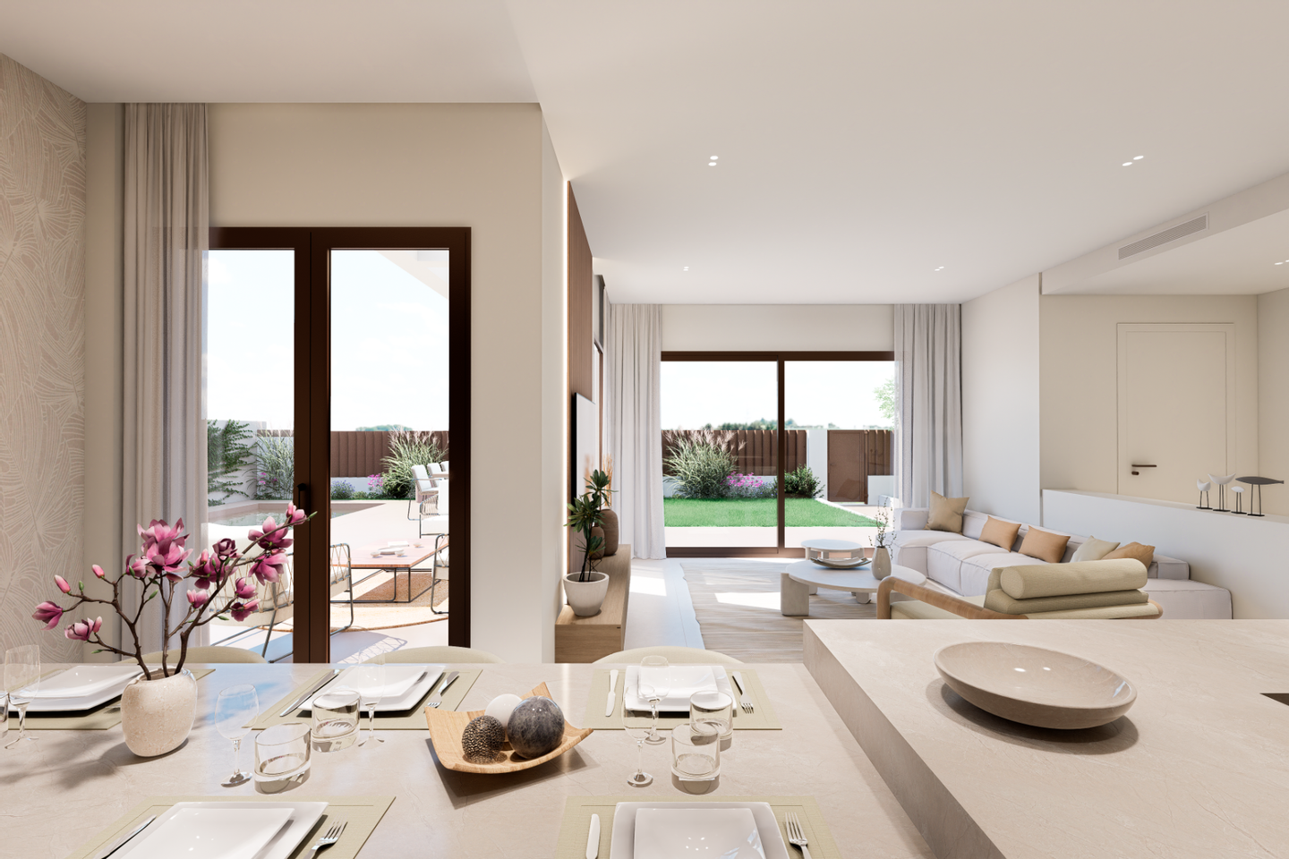 Jedes Haus wurde sorgfältig entworfen, um das natürliche Licht zu maximieren und Räume zu schaffen, in denen Komfort und Eleganz zusammenkommen. Die Innenaufteilung dieser besonderen Villa auf einer Ebene besteht aus einer Eingangshalle, die zum hellen und geräumigen offenen Wohn- und Essbereich mit mehreren großen Fenstern führt, die Zugang zur Terrasse und zum Garten bieten. Im Hauptwohnbereich befindet sich eine Küche im amerikanischen Stil mit Mittelinsel, die ein funktionelles Design, moderne Möbel und intelligente Räume bietet. Neben der Küche befindet sich eine nützliche separate Waschküche. Zu jeder Wohnung gehört auch eine Primärsuite, die für mehr Komfort und Abgeschiedenheit sorgt. Im Gegensatz zu den offenen, gläsernen Hotelbädern bietet die Primary Suite eine vollständige Trennung zwischen dem Schlafbereich und dem Badezimmer, so dass eine ruhige, ungestörte Nachtruhe ohne Licht-, Lärm- oder Geruchsbelästigung gewährleistet ist. Dieses Schlafzimmer wurde im Hinblick auf das Wohlbefinden geschaffen und bietet eine ruhige und funktionelle Umgebung für diejenigen, die echten Komfort zu Hause schätzen. Es gibt zwei weitere große Doppelschlafzimmer, die durch eine Doppeltür Zugang zu einem Familienbad haben, und ein separates Gästebad. Der Außenbereich ermöglicht es Ihnen, das Leben im Freien in Spanien mit einem großen privaten Garten, einem Terrassenbereich und einem privaten Swimmingpool zu genießen. Eine Außentreppe an der Seite des Anwesens führt hinauf zur 74 m2 großen Dachterrasse, auf der Sie den ganzen Tag über die Sonne genießen können.