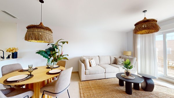 Die Innenausstattung besteht aus einem hellen und geräumigen offenen Wohn- und Essbereich mit Terrassentüren, die auf die Terrasse führen. Im Hauptwohnbereich befindet sich eine voll ausgestattete moderne Küche im amerikanischen Stil mit oberen und unteren Schränken in Eiche und Weiß. Ein großes Hauptschlafzimmer mit eigenem Bad, zwei weitere große Doppelschlafzimmer und ein separates Gästebad. Die Penthäuser und die Bungalows im obersten Stockwerk verfügen über eine Außentreppe auf der Terrasse, die auf die große Dachterrasse mit 38 m2 (Penthäuser) bzw. 81 m2 (Bungalows im obersten Stockwerk) führt. Die Wohnungen verfügen über eine vorinstallierte Klimaanlage, elektrische Küchengeräte (Backofen, Ceran-Kochfeld, Dunstabzugshaube, Mikrowelle, Kühl-Gefrierkombination, Geschirrspüler und Waschmaschine), Einbauschränke mit Regalen und Schubladen in allen Schlafzimmern, eine Sommerküche auf der Sonnenterrasse für die Penthäuser, einschließlich eines kleinen Kühlschranks, und alle Wohnungen haben einen privaten Parkplatz entweder in der Tiefgarage oder einen privaten Außenparkplatz.