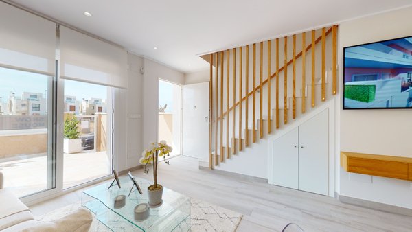 Die Reihenhäuser erstrecken sich über zwei Etagen mit einer Dachterrasse. Die Innenausstattung besteht aus einem hellen und geräumigen offenen Wohn- und Essbereich mit Terrassentüren, die auf die vordere Terrasse führen. Im Hauptwohnbereich befindet sich eine voll ausgestattete moderne Küche im amerikanischen Stil mit Ober- und Unterschränken in Eiche und Weiß. Die Küche hat eine Zugangstür, die auf den hinteren Innenhof führt. Im Erdgeschoss befinden sich außerdem ein Schlafzimmer mit Doppelbett und ein separates Gästebad. Die Innentreppe führt Sie in den ersten Stock, wo sich das Hauptschlafzimmer mit Terrassentüren befindet, die Zugang zu einer privaten Sonnenterrasse von 16 m2 bieten. Es gibt ein weiteres großes Schlafzimmer mit Doppelbett und ein zweites separates Gästebad. Die Sonnenterrasse im ersten Stock verfügt über eine Außentreppe, die zur großen Dachterrasse von 34 m2 oder 36 m2 führt, wo man den ganzen Tag die Sonne genießen kann. Die Wohnungen verfügen über eine vorinstallierte Klimaanlage, elektrische Küchengeräte (Backofen, Cerankochfeld, Dunstabzugshaube, Mikrowelle, Kühl- und Gefrierschrank, Geschirrspüler und Waschmaschine), Einbauschränke mit Regalen und Schubladen in allen Schlafzimmern, und alle Wohnungen haben einen privaten Parkplatz entweder in der Tiefgarage oder einen privaten Außenparkplatz.