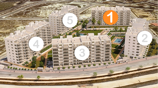 Ein brandneues Wohnprojekt, bestehend aus fünf Wohnblöcken mit Wohnungen mit 2 oder 3 Schlafzimmern und 2 Bädern, die von einem großen Gemeinschaftsgarten von fast