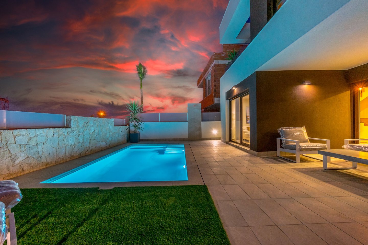 Die Villen verfügen über eine Klimaanlage, eine Vorinstallation für Solarpaneele auf dem Dach, Elektrogeräte in der Küche, Einbauschränke in allen Schlafzimmern, LED-Beleuchtung innen und außen, elektrische Jalousien, eine Video-Gegensprechanlage, einen privaten Swimmingpool mit Vorinstallation für eine Wärmepumpe und einen privaten Parkplatz auf dem Grundstück mit einem automatischen Eingangstor.