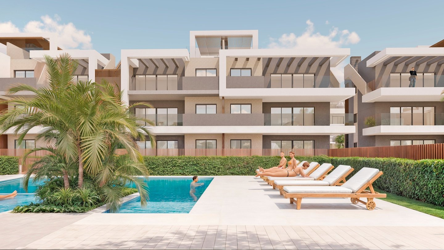 Eine brandneue Wohnanlage mit insgesamt 48 touristischen Apartments und Bungalows mit 2 oder 3 Schlafzimmern und 2 Bädern in Torre de la Horadada (Alicante), nur 5 Gehminuten von den Sandstränden Playa de las Higuericas und Playa de las Villas