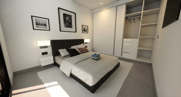 Die Villen wurden in einem modernen Stil und mit einem offenen Konzept entworfen. Dieses besondere Villenmodell befindet sich auf einer Ebene und die Innenaufteilung besteht aus einem hellen und geräumigen Wohn- und Essbereich mit großen Fenstern, die sich zur Terrasse und zum Garten hin öffnen. Im Hauptwohnbereich befindet sich eine voll ausgestattete Küche im amerikanischen Stil mit weißen Schränken und einer schwarzen Granitarbeitsplatte. Das große Hauptschlafzimmer verfügt über ein eigenes Bad und einen geräumigen Kleiderschrank. Es gibt zwei weitere, gut dimensionierte Doppelschlafzimmer, alle Schlafzimmer haben einen Zugang zur Hauptterrasse und es gibt ein separates Gästebad. Eine Außentreppe an der Seite des Anwesens führt Sie auf die große Dachterrasse von 68m2 mit einer Sommerküche, perfekt um im Freien in der Sonne zu speisen.