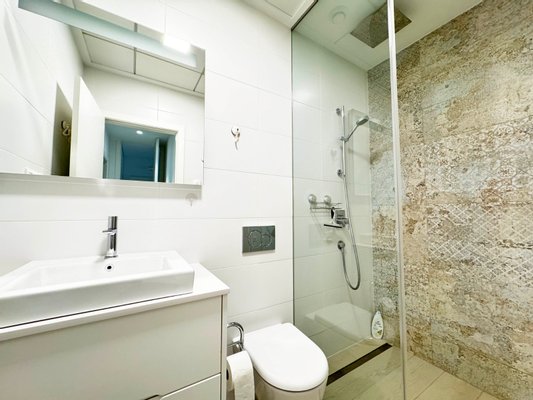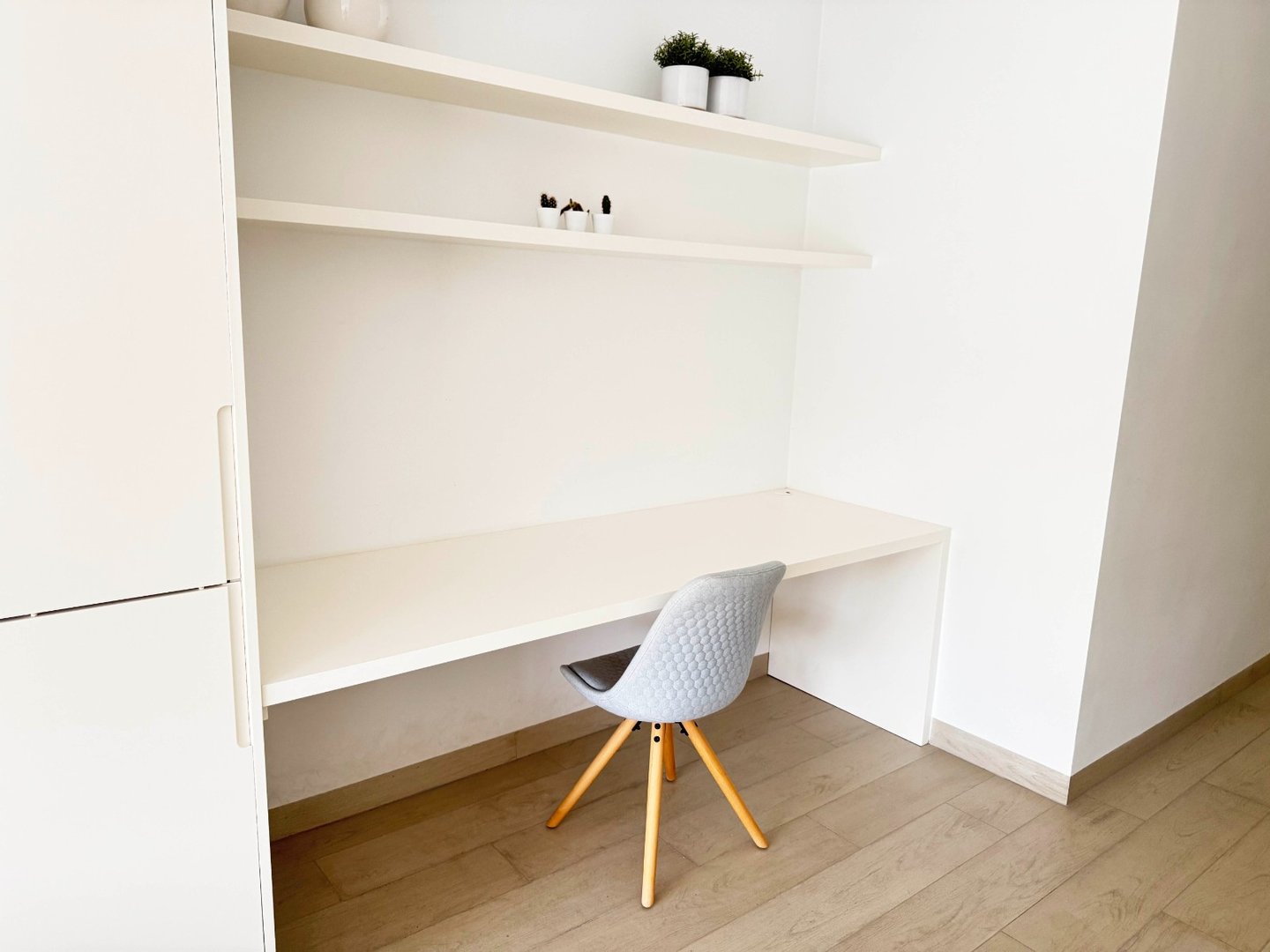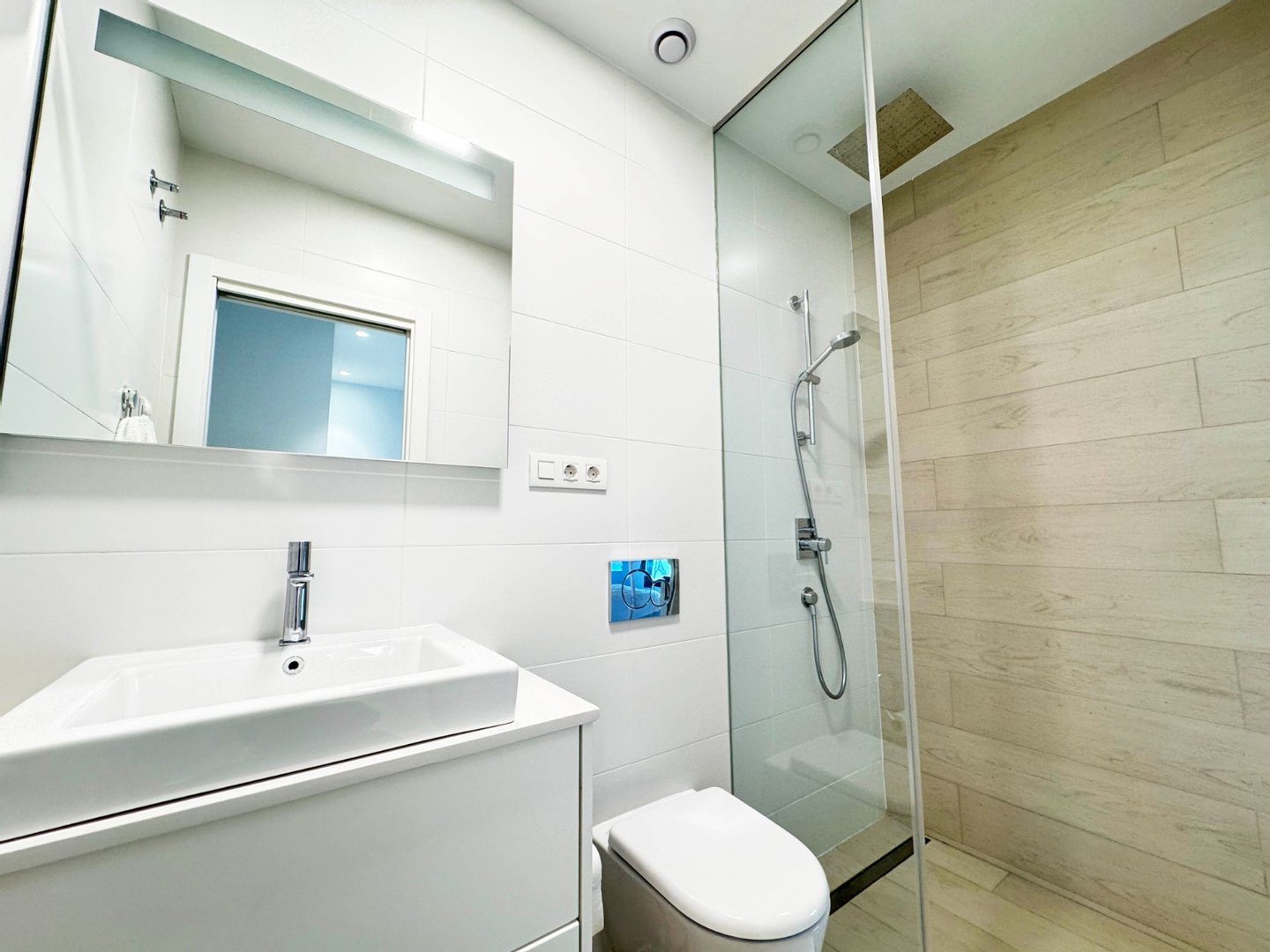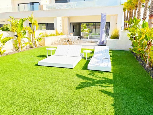 Das Innere wurde mit einem luxuriösen Finish mit Top-Qualität Ausrüstung entworfen. Der Grundriss besteht aus einem Eingangsflur, der zum hellen und geräumigen offenen Wohn- und Essbereich mit großen Fenstern führt, die sich zur Terrasse und zum Garten hin öffnen. Im Hauptwohnbereich befindet sich eine voll ausgestattete, weiße Küche im amerikanischen Stil mit einem eleganten Design, bei dem der Bereich für die Essenszubereitung vollständig geschlossen werden kann, wenn er nicht gebraucht wird. Das große Hauptschlafzimmer verfügt über ein eigenes Bad mit Regendusche und Einbauschränken und hat ebenfalls einen Zugang zur Hauptterrasse. Es gibt zwei weitere große Schlafzimmer mit Blick auf die grüne Landschaft auf der Rückseite des Anwesens, beide Schlafzimmer mit Einbauschränken, und es gibt ein separates Gästebad mit Regendusche. Die Immobilie wurde geschmackvoll in neutralen Tönen gestaltet und dekoriert, einschließlich heller holzfarbener Fliesen in der gesamten Wohnung, die sich bis zur Terrasse erstrecken, die den Innen- und Außenbereich zu einer Einheit verbindet. Die Immobilie wird voll möbliert verkauft und beinhaltet eine Klimaanlage, Fußbodenheizung in beiden Bädern, ein Hausautomatisierungssystem mit Domotica, elektrische Innenjalousien und eine private Tiefgarage mit Abstellraum.