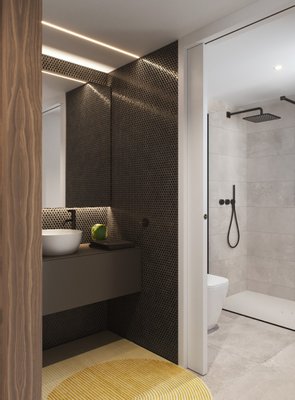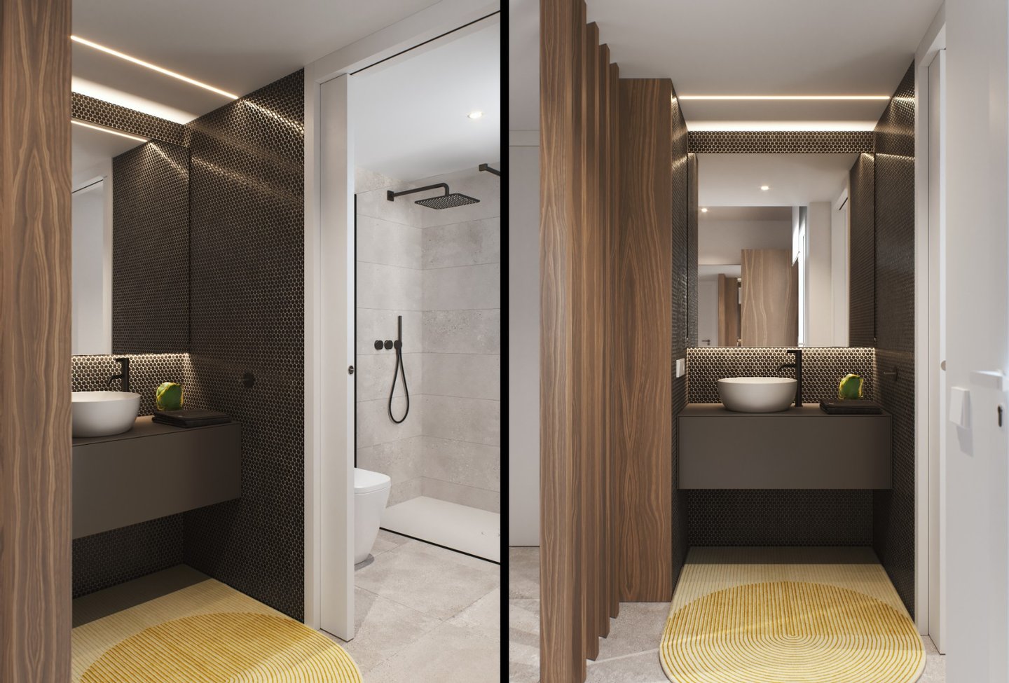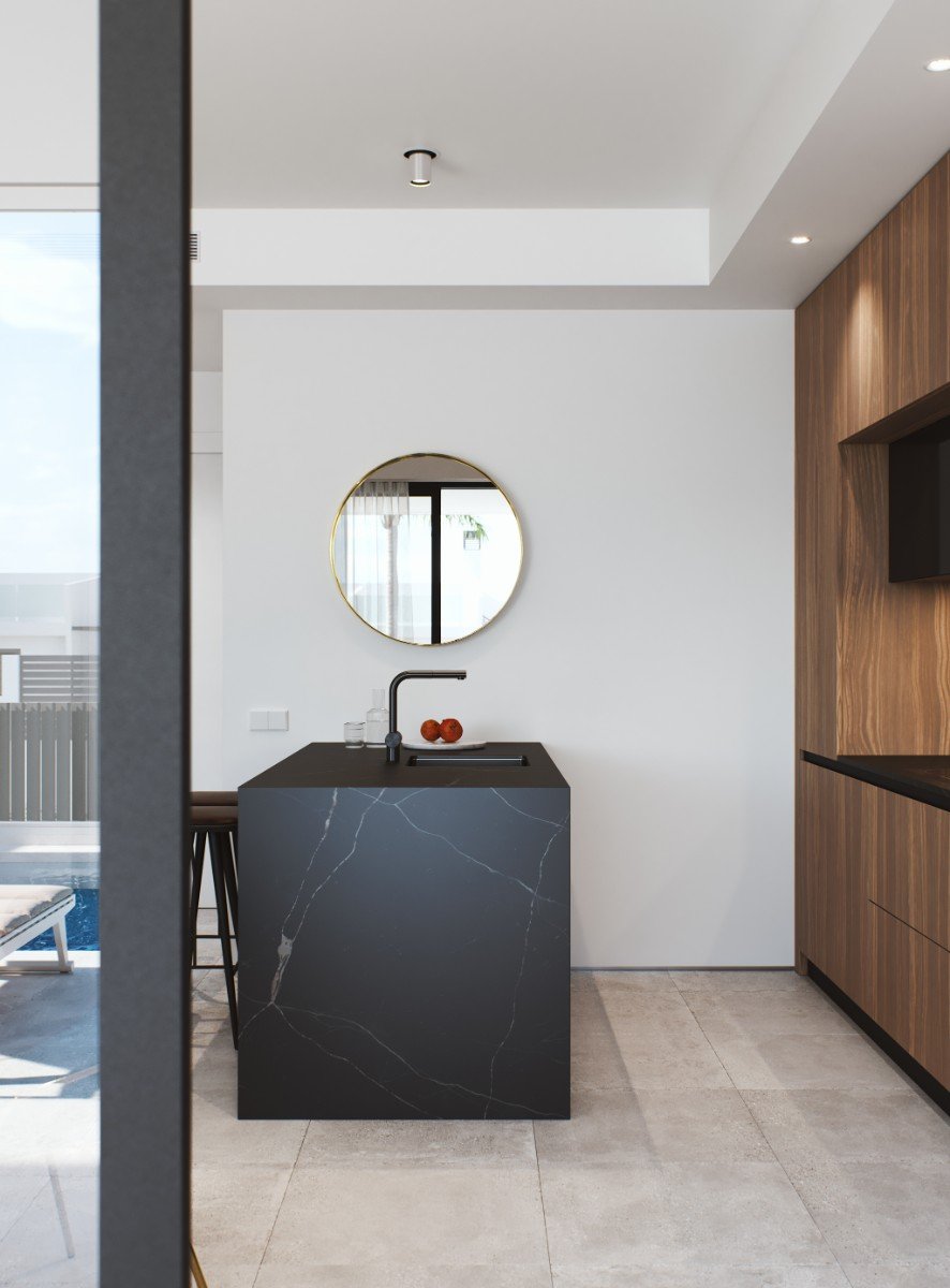 Die Innenaufteilung besteht aus einer Eingangshalle, die zum hellen und geräumigen offenen Wohn- und Essbereich mit einer viereinhalb Meter langen Terrassentür führt, die vollständig geöffnet und in der Wand versteckt werden kann, was den Raum öffnet und eine Verbindung zur Terrasse schafft. Ein schönes Designmerkmal ist das dekorative Holzlattengitter, das die Räume in der Wohnhalle und im Hauptschlafzimmer voneinander trennt. Im Hauptwohnbereich befindet sich eine moderne Küche im amerikanischen Stil mit einer Mittelinsel, die Küchenplatte und die Insel sind aus Silestone, Porzellan oder einem ähnlichen Material, und es gibt ein nützliches Gäste-WC. Im Erdgeschoss befindet sich auch ein großes Schlafzimmer mit Doppelbett und eigenem Bad. Die Innentreppe führt Sie in den ersten Stock, wo sich die beeindruckende Hauptsuite mit einem großen Schlafzimmer, einem eigenen Bad und einem Ankleidebereich befindet. Auf der ersten Etage befindet sich ein weiteres Doppelschlafzimmer mit eigenem Bad und Ankleidebereich, das Zugang zur vorderen Terrasse hat. Der Flur im ersten Stock hat Zugang zur Außentreppe, die auf die große Dachterrasse von 46m2 führt, um den ganzen Tag die Sonne zu genießen und hat Vorinstallationen für eine Sommerküche, Jacuzzi und Solarpanel.