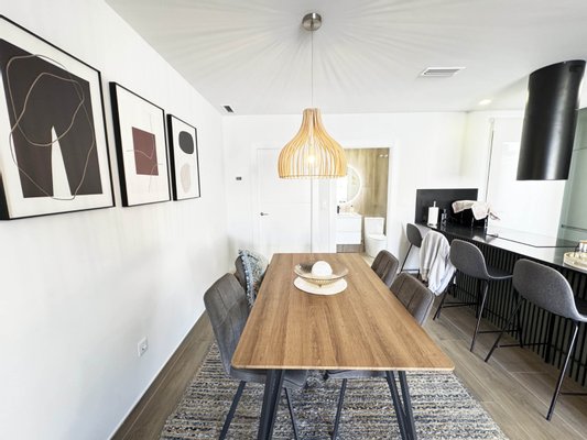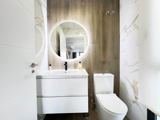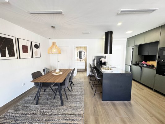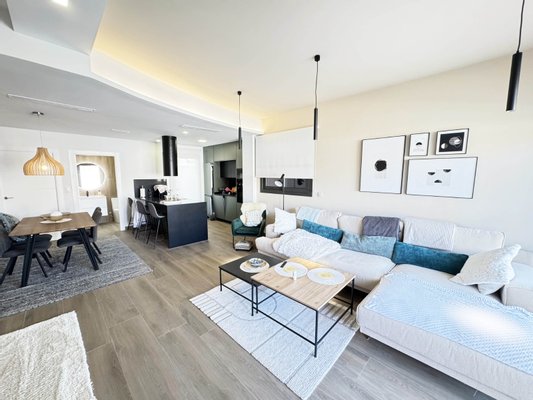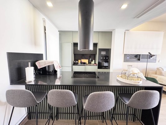 Die Innenaufteilung besteht aus einem hellen und geräumigen offenen Wohn- und Essbereich mit großen Fenstern, die viel natürliches Licht in das Haus strömen lassen und Zugang zur vorderen Terrasse bieten. Im Hauptwohnbereich befindet sich eine voll ausgestattete moderne Küche im amerikanischen Stil mit Mittelinsel und Sitzbereich. Die Küche ist einzigartig und in Grün- und Schwarztönen gehalten, die das zeitgenössische Design der Villa ergänzen. Die Küche hat eine Zugangstür zur hinteren Terrasse, und im Erdgeschoss befinden sich auch eine Gästetoilette und ein nützlicher Abstellraum / Speisekammer. Über die Innentreppe gelangt man in den ersten Stock, wo sich das Hauptschlafzimmer mit eigenem Bad und privater Terrasse befindet, sowie ein weiteres großes Doppelzimmer mit eigenem Bad. Über die Innentreppe gelangt man auch auf die große Dachterrasse von 22 m2.