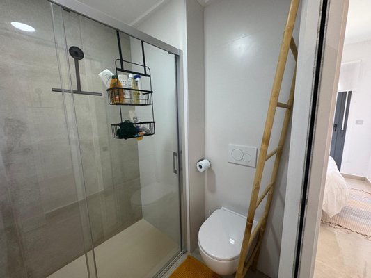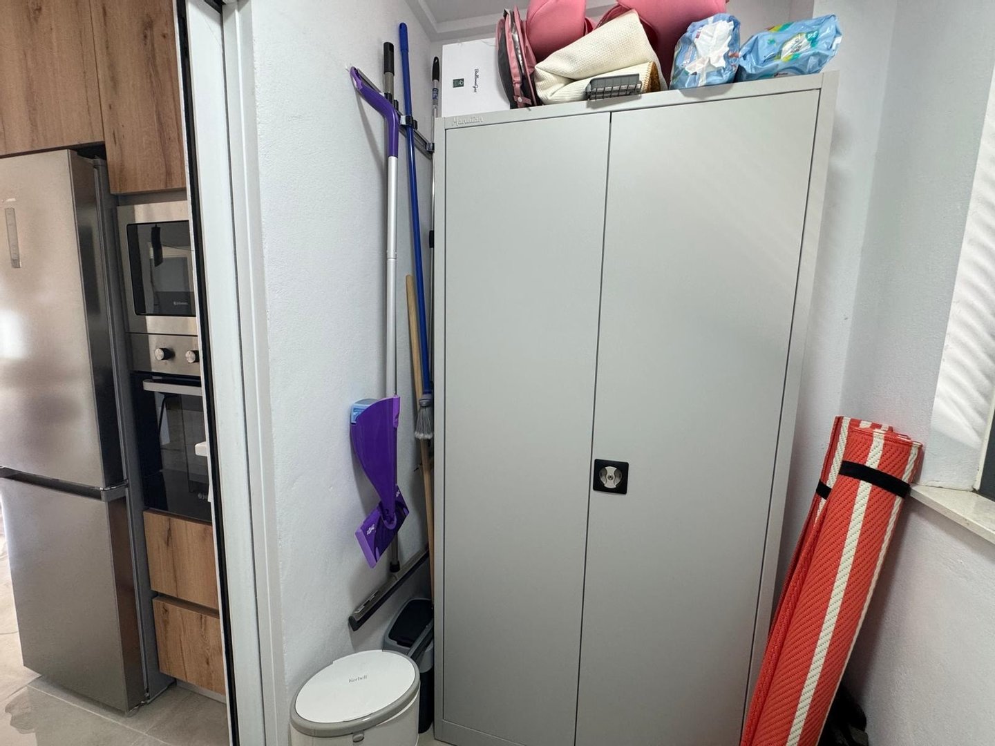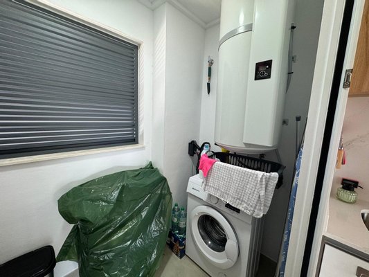 Die Innenausstattung besteht aus einem hellen, offenen Wohn- und Essbereich mit Terrassentüren, die Zugang zur privaten Terrasse bieten. Im Hauptwohnbereich befindet sich eine voll ausgestattete moderne Küche im amerikanischen Stil, die in Weiß und Holztönen gehalten ist, und eine Zugangstür führt zu einem separaten Hauswirtschaftsraum. Das Hauptschlafzimmer verfügt über ein eigenes Bad und eine Terrassentür mit Zugang zur Terrasse. Es gibt ein weiteres großes Schlafzimmer mit Doppelbett und ein separates Gästebad. Die Terrasse hat eine Außentreppe, die Sie auf die große Dachterrasse von 62m2 führt.