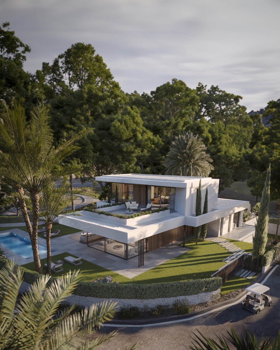 Die Villa besteht aus einer Reihe von räumlichen Unterteilungen mit 4 Schlafzimmern, 5 Bädern und einer Garage, in denen verschiedene unabhängige Atmosphären geschaffen werden, die einen intimen und gemütlichen Raum erzeugen. Im Hauptgeschoss verschmelzen die Küche, der Ess- und der Wohnbereich zu einer sauberen, hellen und offenen Umgebung. Das Schlafzimmer und das Badezimmer auf dieser Etage sind in einer natürlichen und einzigartigen Umgebung mit Blick nach draußen untergebracht. Neben diesen Räumen befindet sich ein Kino zum Genießen und Entspannen. Im Obergeschoss befindet sich das Hauptschlafzimmer mit einer großen Terrasse, die einen offenen und privilegierten Blick bietet.