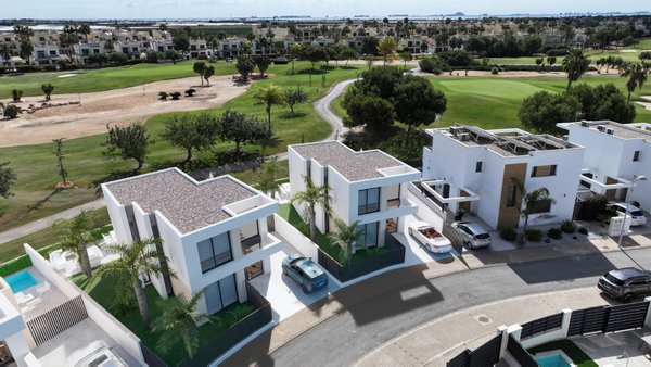 Ein brandneues Projekt mit freistehenden Villen in erster Golflinie mit 3 Schlafzimmern, 3 Bädern und privatem Swimmingpool mit Blick auf das wunderschöne 12. Fairway im renommierten Roda Golf and Beach Resort – Los Alcazares (Murcia), das mit spektakulären freien Ausblicken aufwartet, von Annehmlichkeiten und Sportanlagen umgeben ist und in der Nähe des Meeres liegt. Diese charakteristischen Villen zeichnen sich durch ein zeitgemäßes Design mit offenem Blick auf den Golfplatz und eine Architektur aus, die die umgebende Landschaft einbezieht. Diese Luxusimmobilien bieten Privatsphäre und Golf in perfekter Harmonie. Die Villen sind nach Süden ausgerichtet und verfügen über 3 Schlafzimmer, 3 Badezimmer, einen privaten Swimmingpool und einen privaten Parkplatz sowie fantastische Innen- und Außenbereiche. Der Außenbereich nutzt das Leben im Freien in Spanien optimal aus, mit einem großen privaten Garten, offenen und überdachten Terrassenbereichen, auf denen Sie sich entspannen und erholen sowie mit Familie und Freunden im Freien speisen können. Der einladende private Swimmingpool von fast 18 m² ermöglicht es Ihnen, sich bei warmen Temperaturen abzukühlen. Jede Immobilie erstreckt sich über zwei Etagen mit einem Solarium und verfügt über ein innovatives Design mit zeitgemäßem Stil und offenem Grundriss. Der Innenbereich umfasst einen großen Eingangsbereich mit einer auffälligen Treppe, die zu einem hellen und geräumigen offenen Wohn- und Essbereich mit Panorama-Glastüren führt, die viel Tageslicht hereinlassen und Zugang zur Terrasse und zum Garten bieten. Im Hauptwohnbereich befindet sich eine voll ausgestattete moderne Küche im amerikanischen Stil mit einer Kochinsel. Im Erdgeschoss befinden sich außerdem ein Doppelzimmer und ein separates Gästebad. Die Innentreppe führt Sie in den ersten Stock mit dem großen Hauptschlafzimmer mit eigenem Bad und reichlich Stauraum. Dort befinden sich außerdem ein weiteres geräumiges Doppelzimmer und ein zweites separates Gästebad. Das Hauptschlafzimmer und der Flur im ersten Stock bieten Zugang zur 27 m² großen Sonnenterrasse mit Blick auf den Garten und den Poolbereich. Die Immobilien entsprechen den höchsten Standards und verfügen über eine Vorinstallation für eine Klimaanlage, 1,5-kW-Photovoltaik-Solarmodule, Fußbodenheizung in den Badezimmern, Küchengeräte (Backofen, Kochfeld, Dunstabzugshaube, Mikrowelle, Kühl-Gefrierkombination, Geschirrspüler und Waschmaschine), Einbauschränke in allen Schlafzimmern, LED-Beleuchtung im Innen- und Außenbereich, motorisierte Rollläden, einen privaten Swimmingpool, eine Außendusche und einen privaten Parkplatz auf dem Grundstück mit Vorinstallation für eine Ladestation für Elektroautos. Das Roda Golf & Beach Resort ist eine einzigartige Wohn- und Ferienanlage, die nur fünf Minuten von der Küste des Mar Menor entfernt liegt. Im Roda Golf & Beach Resort können Sie sich 24 Stunden am Tag in einer privaten und sicheren Umgebung entspannen und in qualitativ hochwertigen Häusern wohnen, die perfekt mit den Farbtönen der Landschaft harmonieren. Es werden zahlreiche Einrichtungen und Dienstleistungen angeboten, darunter: Beach Club in La Manga Del Mar Menor, Kinderspielplätze, Tennisplätze, Padelplätze, Club House, Supermarkt, Golfshop, verschiedene Bars und Restaurants in unmittelbarer Nähe und PGA Golf Academy mit Übungsanlagen (Driving Range, Putting Green, etc.). Der Roda Golfplatz wurde von dem international bekannten Golfarchitekten Dave Thomas entworfen und bietet höchste Qualitätsstandards. Der 18-Loch-Par-72-Platz (6.177 Meter) mit weitläufigen, hügeligen Grüns und strategisch platzierten Bunkern sowie drei großen Seen bietet Unterhaltung und Spannung auf Schritt und Tritt. Die Strände von Los Narejos und Los Alcazares sind nur 2 km von der Anlage entfernt und der internationale Flughafen von Corvera in Murcia ist in weniger als 20 Minuten zu erreichen.