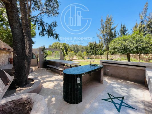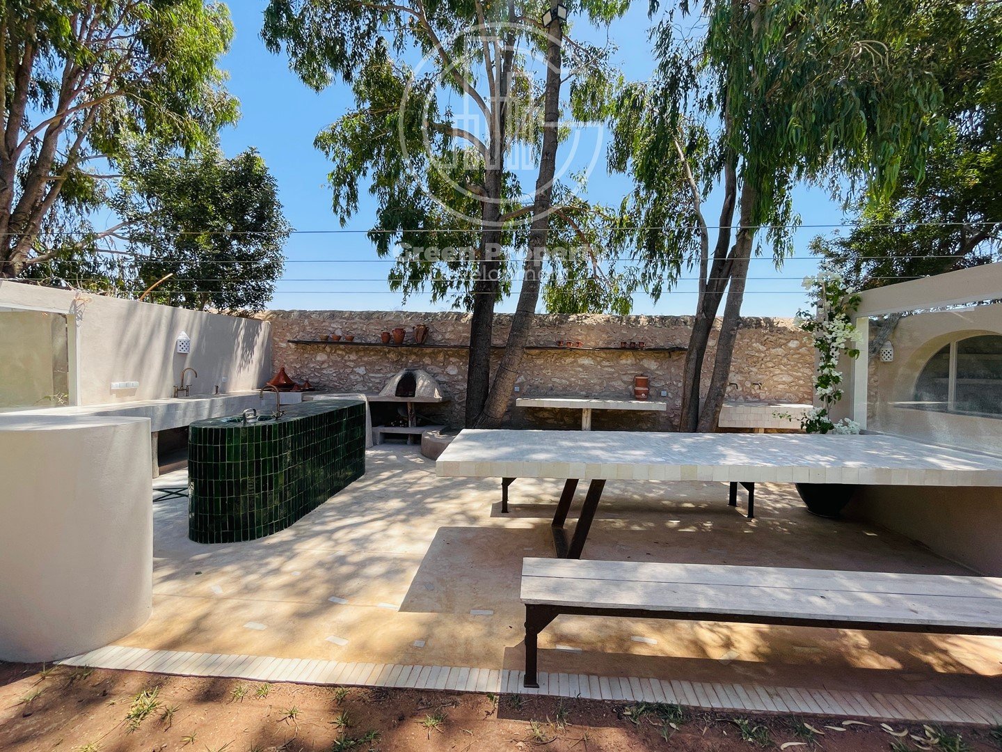 Außenküche (55 m²) mit Brotbackofen, Mechoui-Ofen, Einbaubar, WC und großem Tisch für Mahlzeiten oder Workshops.