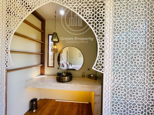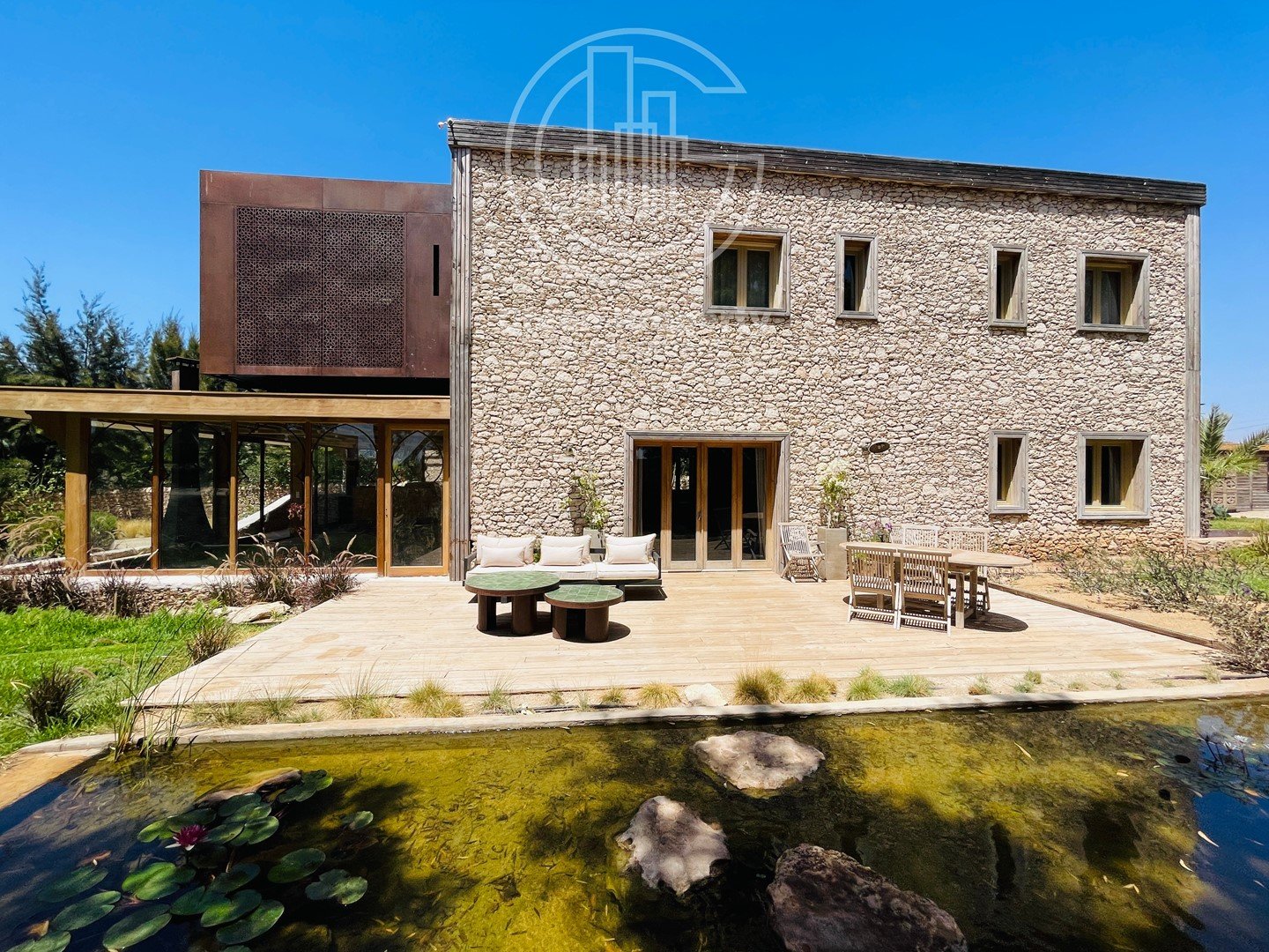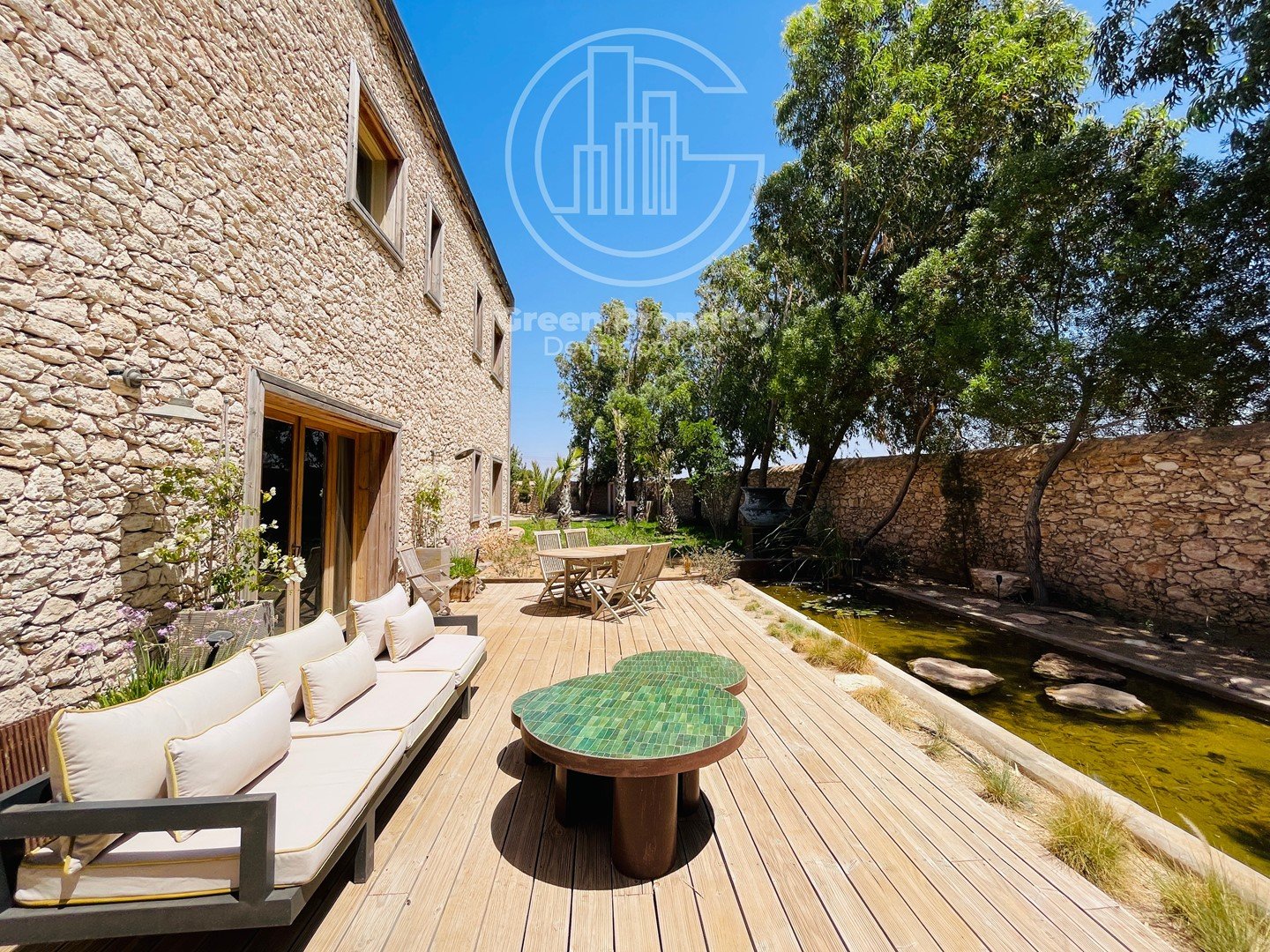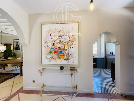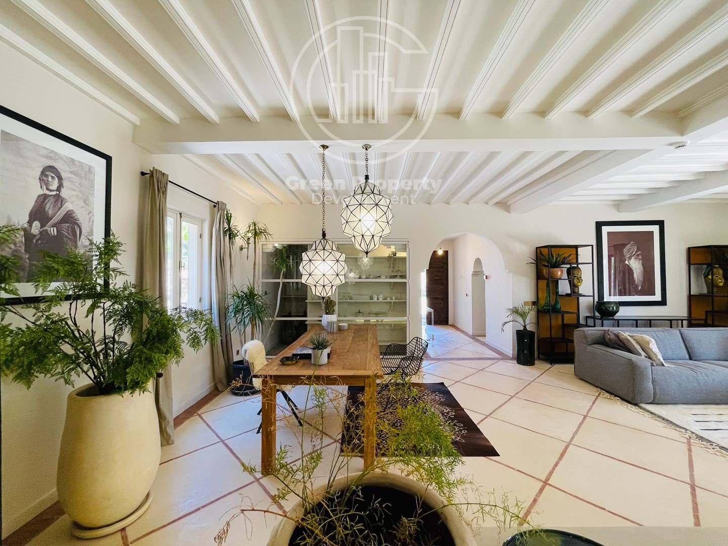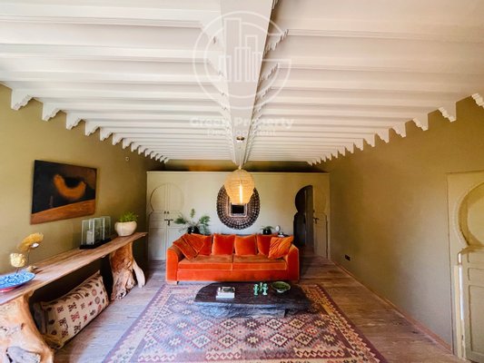Einladender Eingang (8 m²), der zu einer Sommerlounge (67 m²) führt, mit traditionellen Tadlac- und Bejmat-Böden, die mit Berbermotiven verziert sind.
