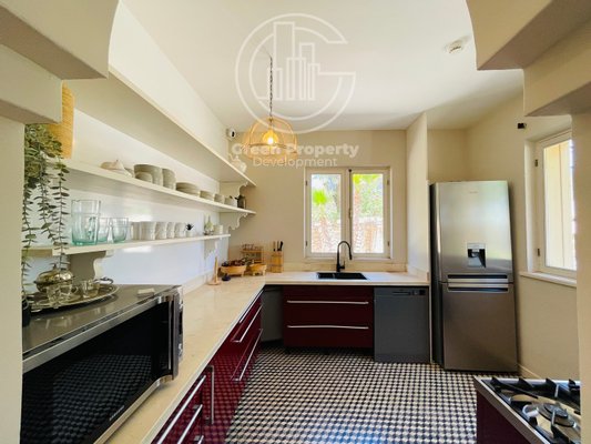 Küche (10 m²) mit Gasherd, Kühlschrank mit Gefrierfach, Mikrowelle und traditionellem Zementfliesenboden.