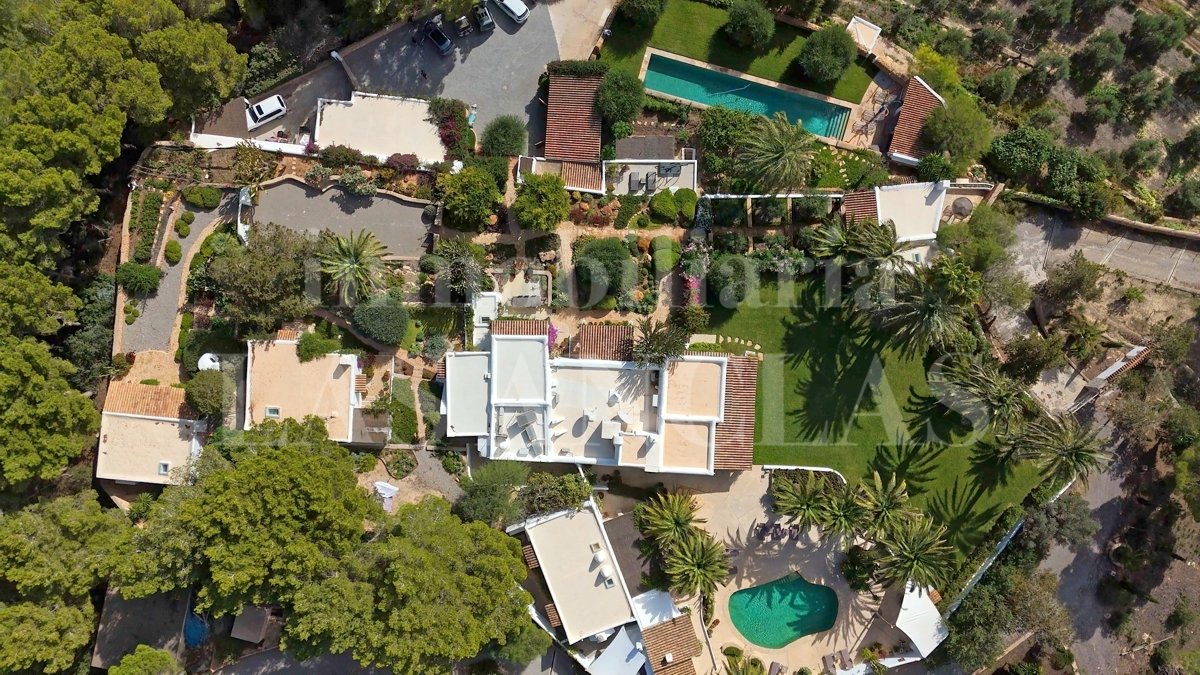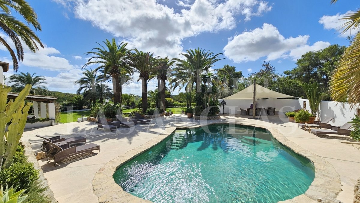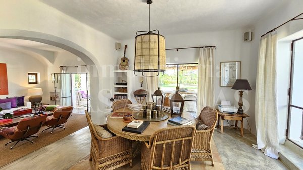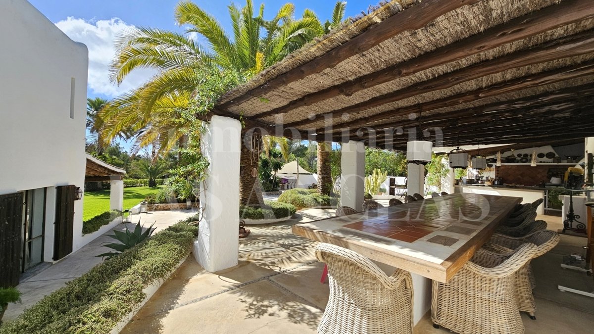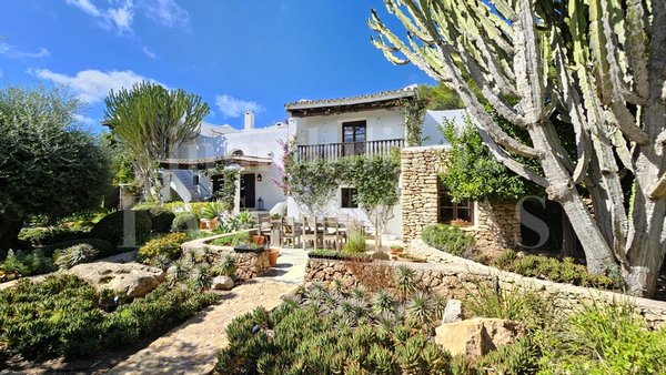 Eingebettet in die sanften, grünen Hügel von San José, präsentiert sich dieses authentische ibizenkische Schmuckstück: eine elegant renovierte Finca, umgeben von einem üppigen mediterranen Garten mit Oliven- und Palmenbäumen, die einen weiten Blick