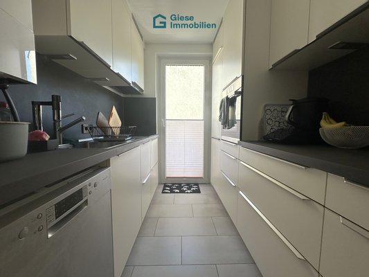 Die weiße hochwertige Einbauküche mit einer Backofen-/Microwellenkombi auf Sichthöhe, Kühl-/Gefrierkombination, Indiktionskochfeld und Geschirrspüler hat einen kleinen Balkon in Westausrichtung zum Hinterhof. Hier befindet sich auch die Gastherme der Etagenheizung.