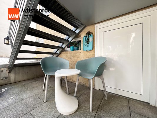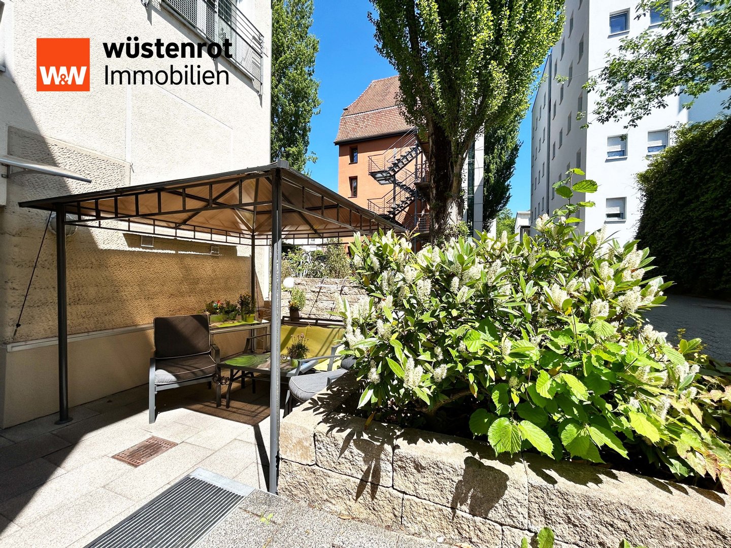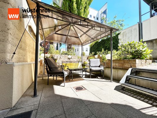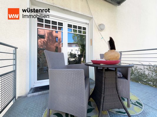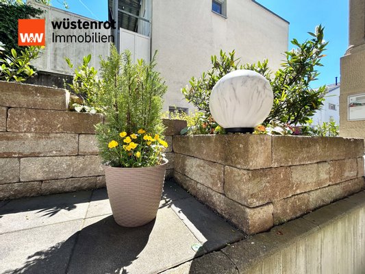 1. Von dem Wohnungseingang aus links haben Sie Ihre eigene Sonnen-Terrasse. Eingefasst von grüner Bepflanzung ist hier ein Platz mit wohltuender Ruhe