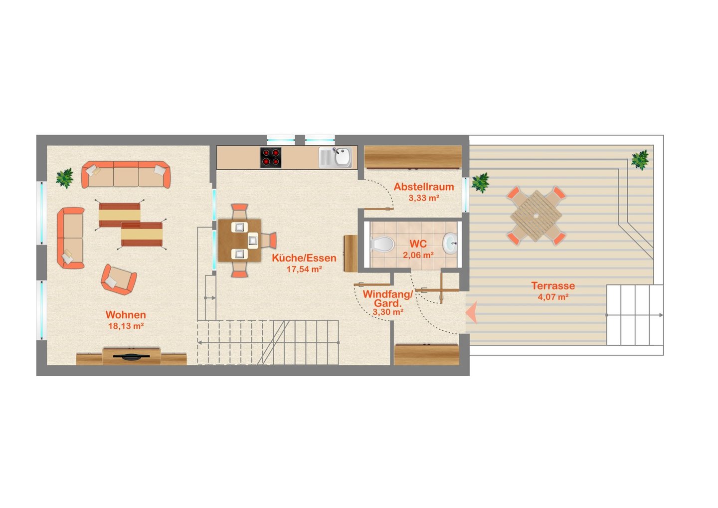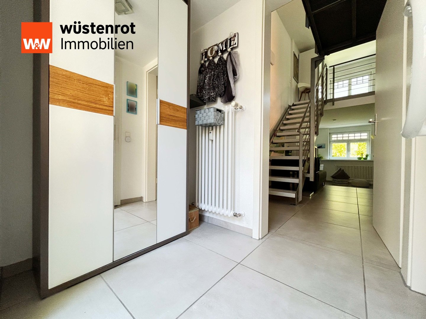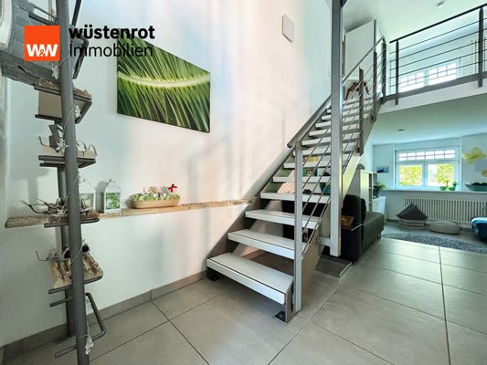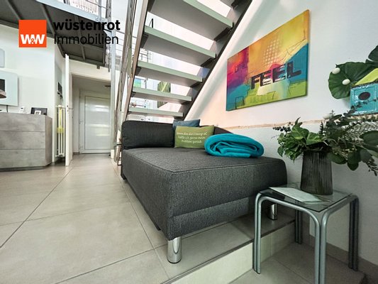Der erste Eindruck beginnt an der Tür. Kein gemeinsames Treppenhaus, nur Ihr eigener Eingang. Dahinter eröffnet sich der Blick in eine offen-gestaltete Wohnwelt über zwei Ebenen.