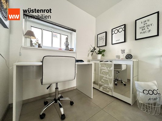 Neben dem Badezimmer ist auf der linken Seite geschickt ein kleiner Bürobereich integriert. Inspiriert durch Offenheit werden Sie an dem Arbeitsplatz die besten Ideen haben.