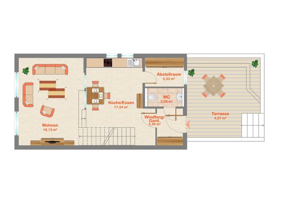Das Highlight im Erdgeschoss ist das große Wohnzimmer. Dieses ist ausgestattet mit großen Fenstern und bietet genug Raum für Ihr gemütliches Couch-Landschaft. Machen Sie es sich bequem.
