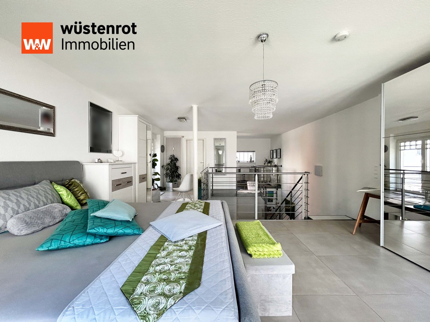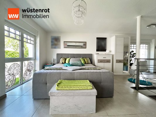 Über eine filigrane Treppe gelangen Sie in das Galeriegeschoss. Hier ist der wunderschöne Schlafraum mit Ankleidebereich. Das Bett bildet den Mittelpunkt dieses offenen Raumes. Mit Blick durch die großen Fenster werden Sie sich bestens erholen. Schließen Sie bei Bedarf gerne die Rollos.