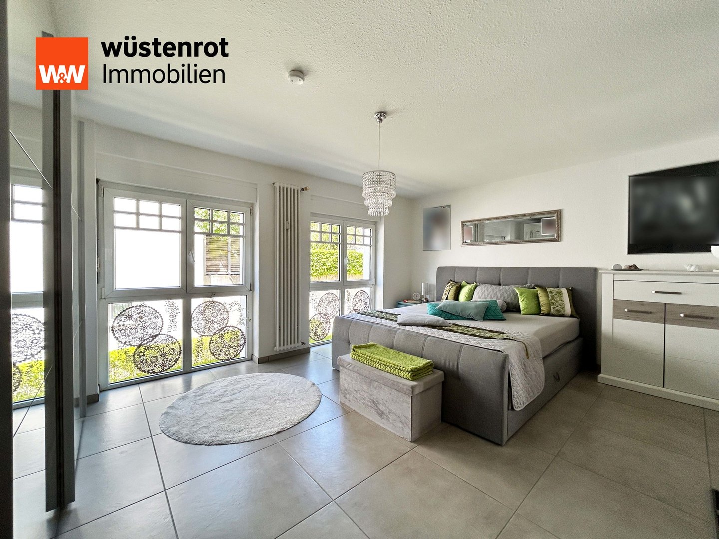 + Es öffnet sich ein lichtdurchflutetes Schlafzimmer mit klaren Linien und hellem Ankleidebereich