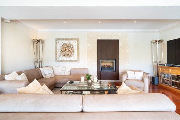 Im Obergeschoss befindet sich das Herzstück des Hauses: ein rund 67 m2 großer Wohn- und Essbereich mit Kamin und bodentiefen Fenstern, die sich zur sonnenverwöhnten Terrasse mit elegantem Poolbereich öffnen. Von hier aus fällt der Blick hinaus auf den Golfplatz.