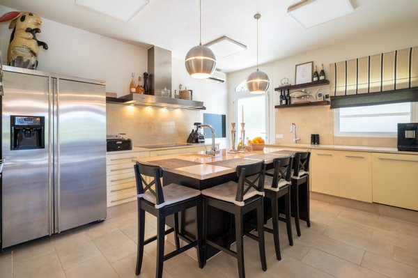 Die angrenzende, halboffene Küche ist großzügig gestaltet und schafft eine perfekte Verbindung zwischen Kulinarik und geselligem Beisammensein.