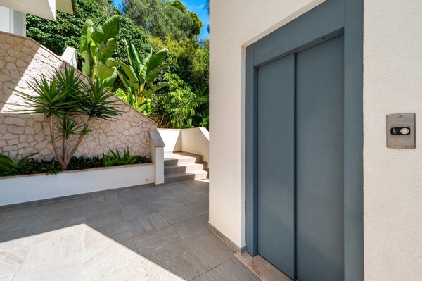 Der Außenbereich ist mediterran inszeniert: Palmen und üppige Pflanzen umrahmen die Villa, schaffen ein idyllisches Ambiente und laden dazu ein, das Leben unter freiem Himmel zu genießen – ob beim Sonnenbaden, Entspannen oder beim Empfang von Gästen.