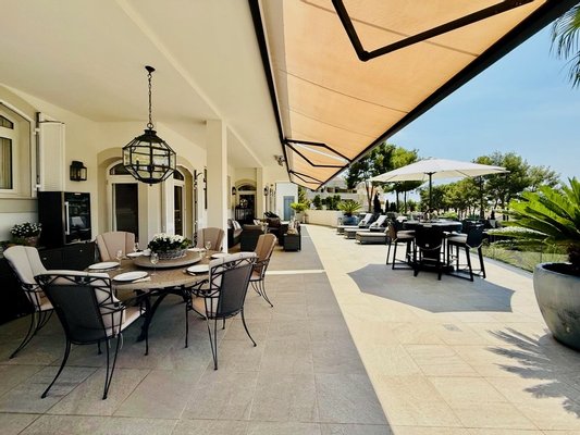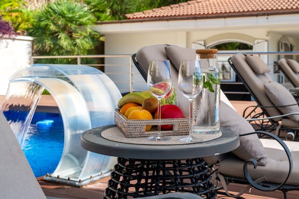 Der Außenbereich ist mediterran inszeniert: Palmen und üppige Pflanzen umrahmen die Villa, schaffen ein idyllisches Ambiente und laden dazu ein, das Leben unter freiem Himmel zu genießen – ob beim Sonnenbaden, Entspannen oder beim Empfang von Gästen.